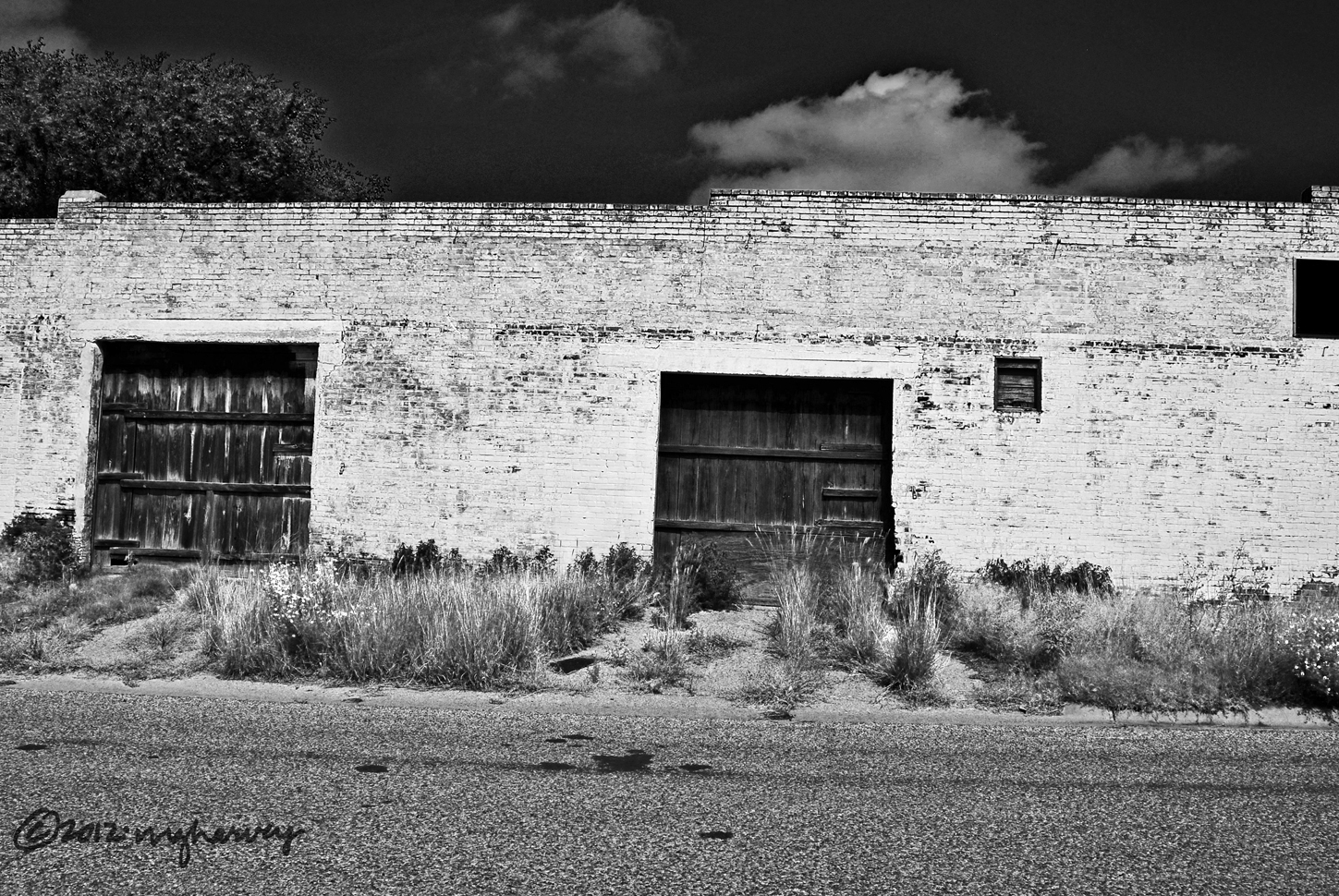 This scene has all the things I love in a photograph: old brick, old wood, new weeds, some sky, a cloud, a bit of pavement. No wonder I stopped to take a picture.