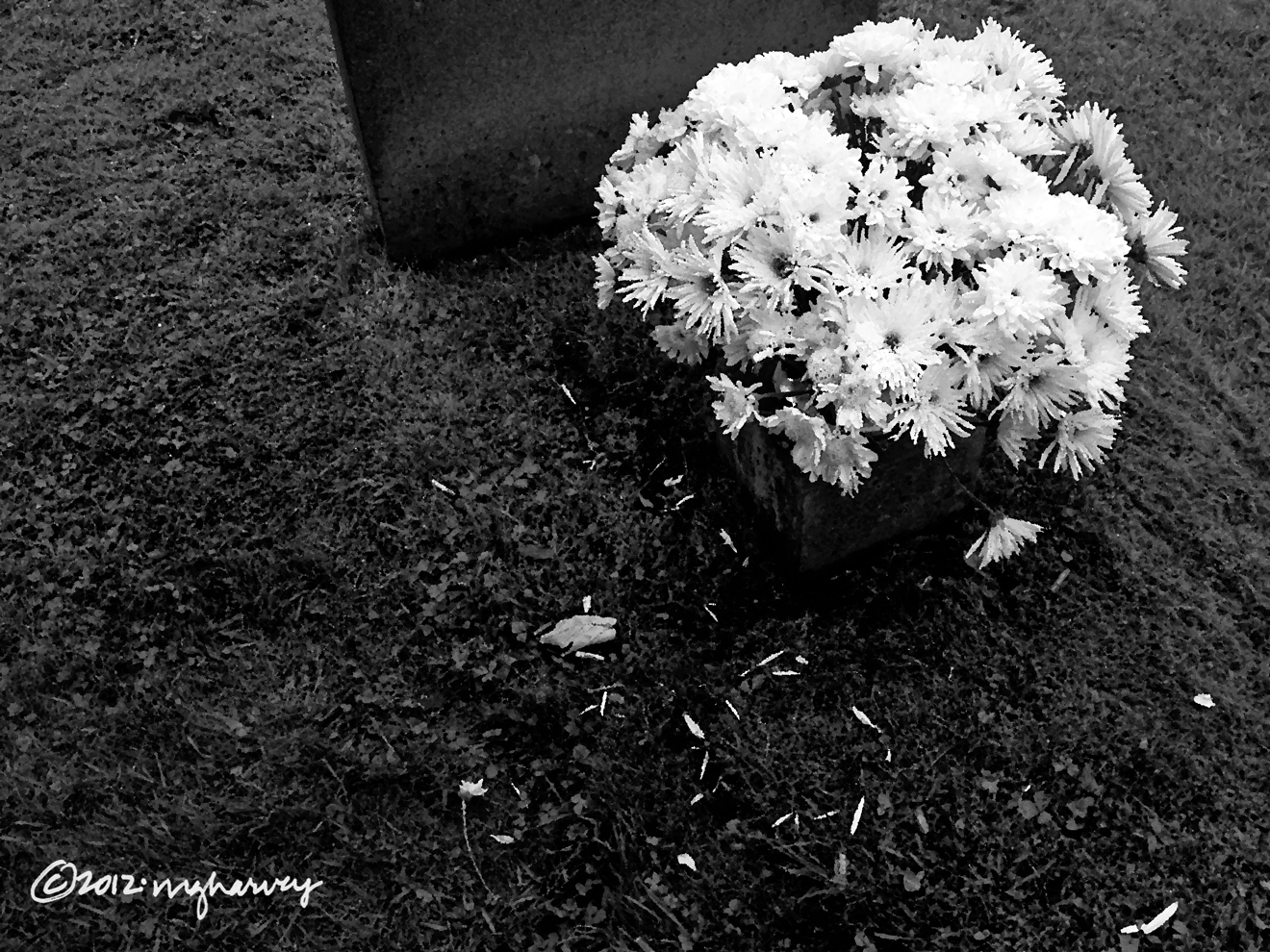 Some shedding chrysanthemums, beside a grave marker in the churchyard of St. Mary’s Church.