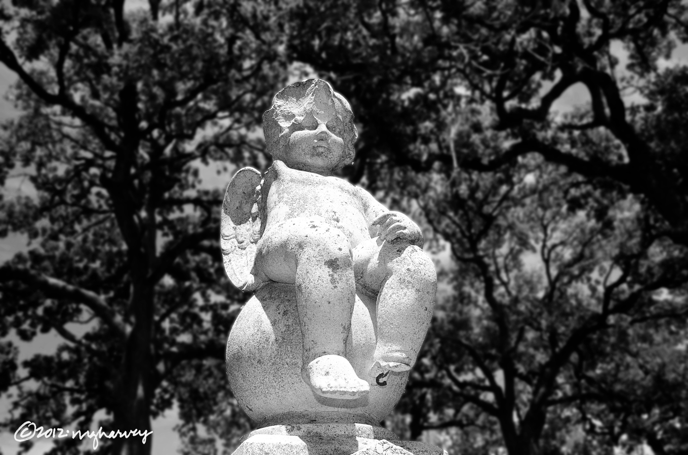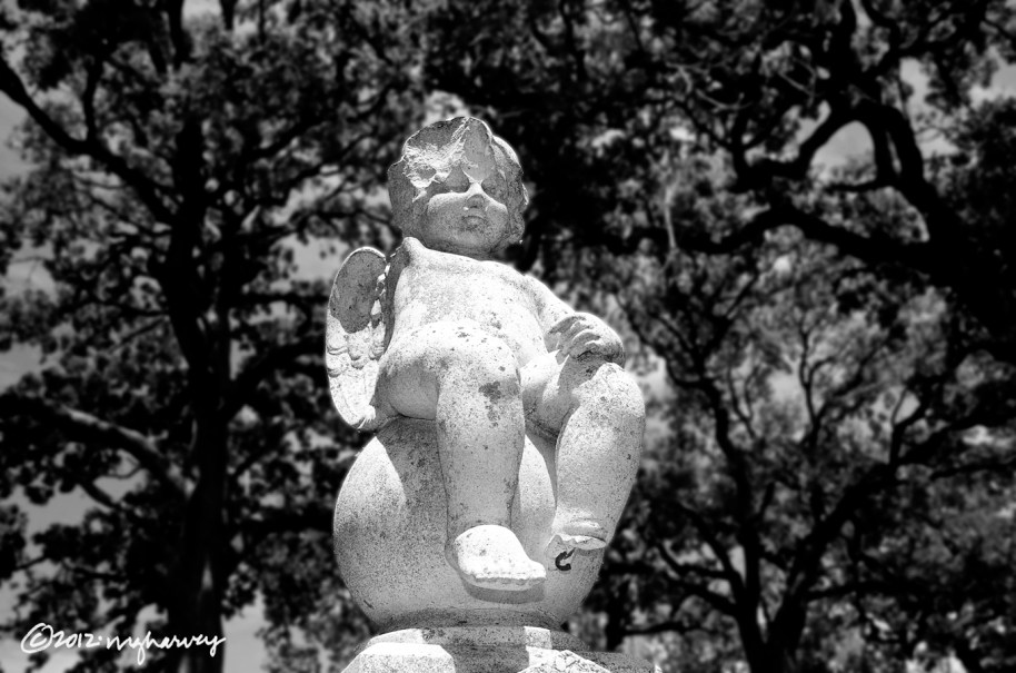 This poor stone cherub is missing an arm, a foot, and part of its head.