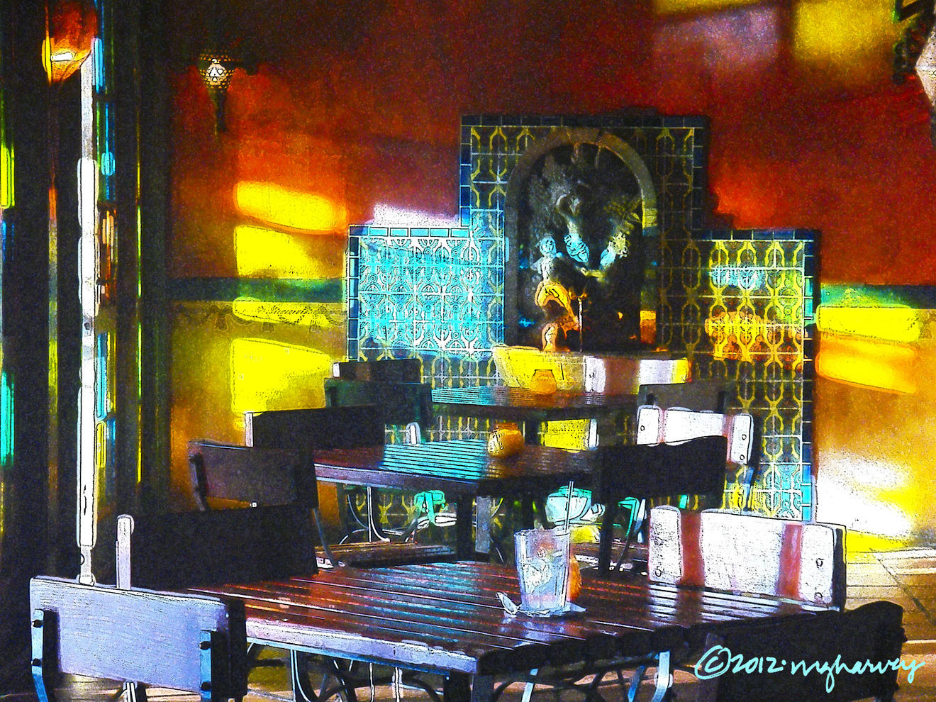 In the bar at the Figueroa Hotel. The lobby of the hotel is very dark, but this little bar catches the afternoon sun, which makes it glow like gems.