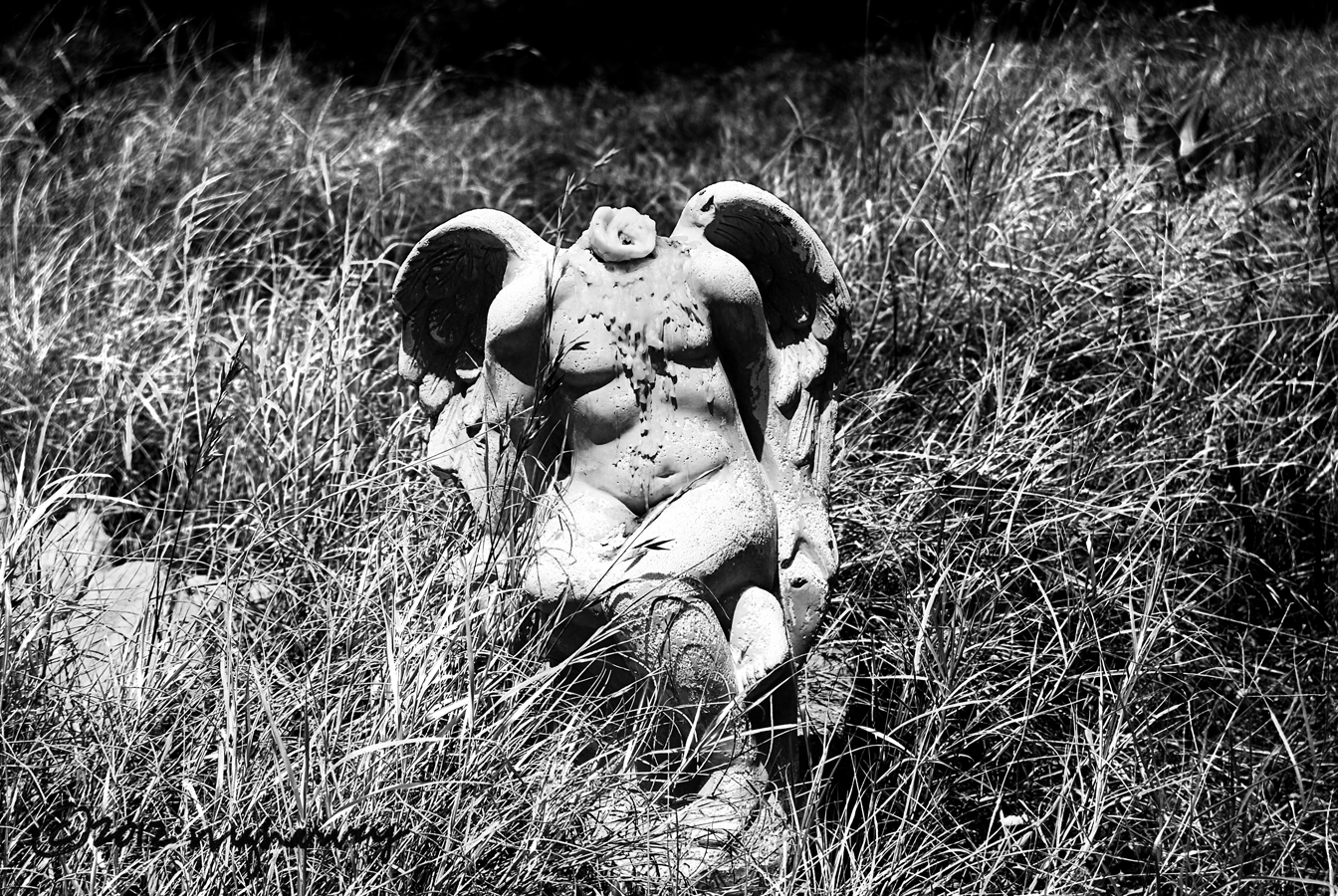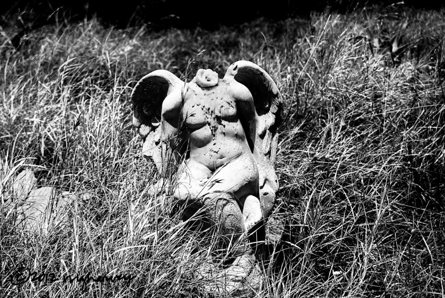 This is one of those times. Why was a cemetery cherub in a vacant lot? What happened to the cherub’s head? And, who poked a candle in the cherub’s neck, lit it, and let wax drip down its chest?