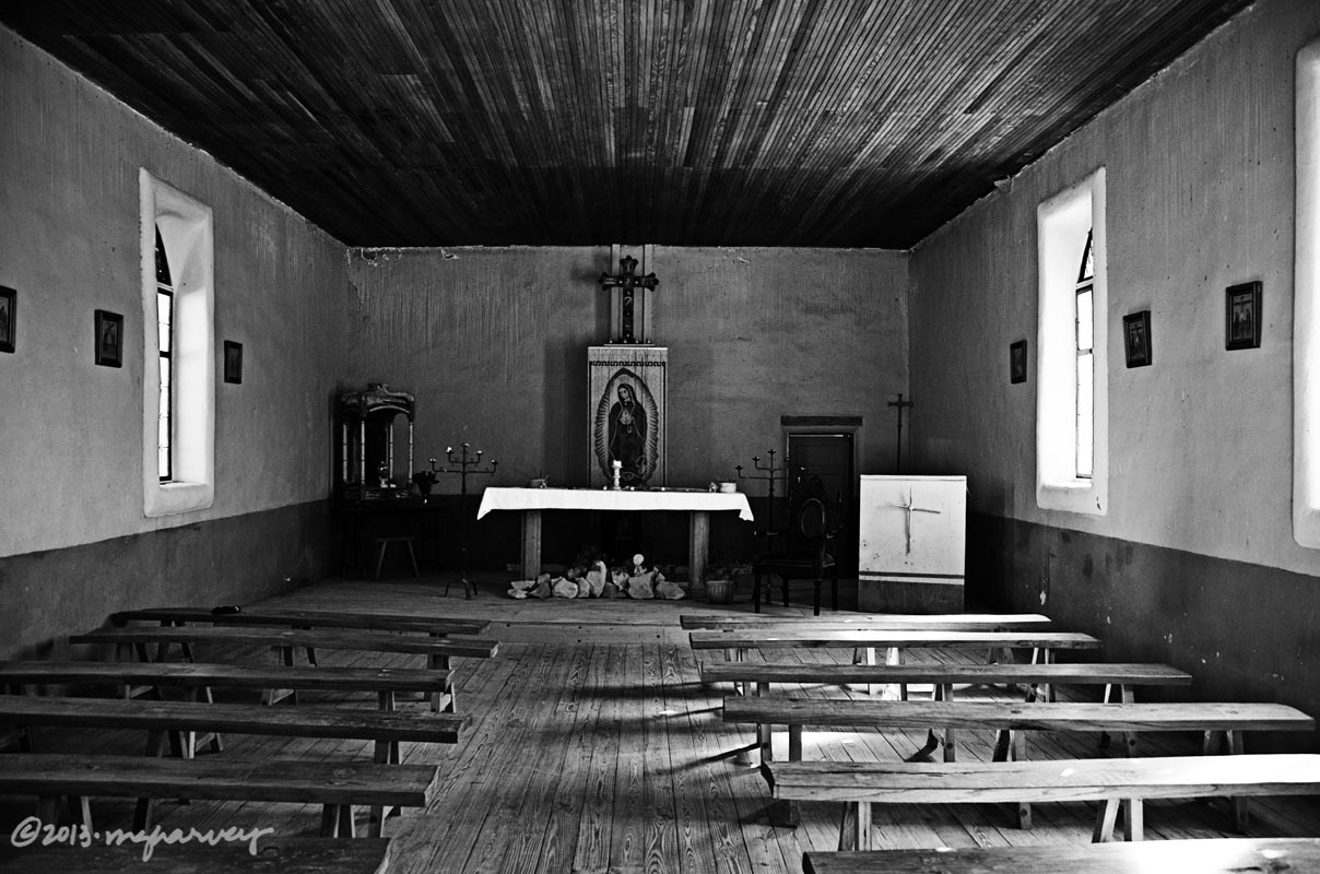 Up the hill from the cemetery, and facing away from the town, is this little church. The only evidence that anyone had been around lately was an apple wedge, slightly dessicated, on the altar.