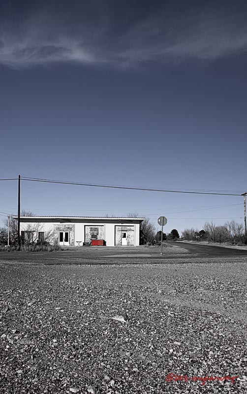First of all, it seemed like if the very reason I made a u-turn across a highway to take a picture was because this old place had a red desk in front of it, then I just had to post it in color.