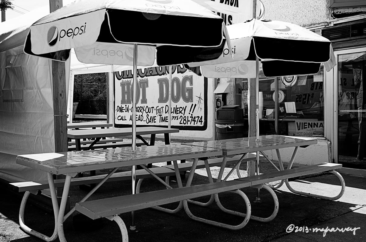I was walking along West Irving Park Road, toward the Red line station on North Sheffield, when this hot dog stand caught my eye. The woman taking her pre-lunch cigarette break next door eyed me, detached herself from the wall, and took one step toward the street to better see what I saw. She soon returned her attention to her cigarette.
