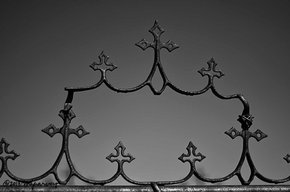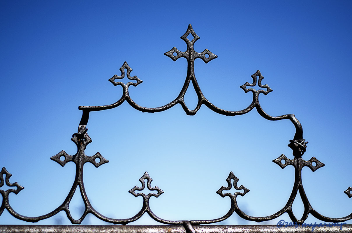 One of the graves had an iron fence around it, and it was topped with this arrangement of crosses. You can tell that someone still looks after the fence and repairs it when warranted. Not all the graves there were that lucky.