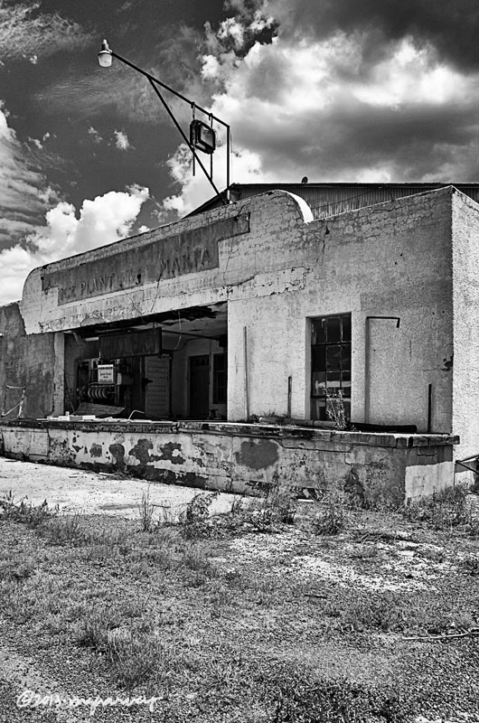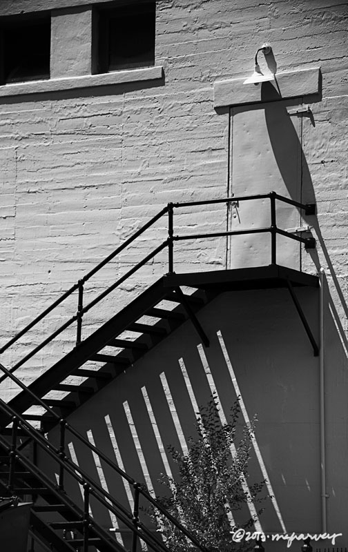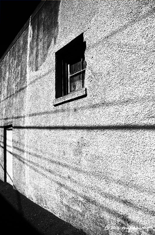 I like shooting wide-open spaces. But I also like the effects of shooting at close range in a narrow alley, which is what I did here, where the lines of the building, the door, the window, and the shadows from the power lines all converge somewhere down the alley – in a vanishing point, if you will.