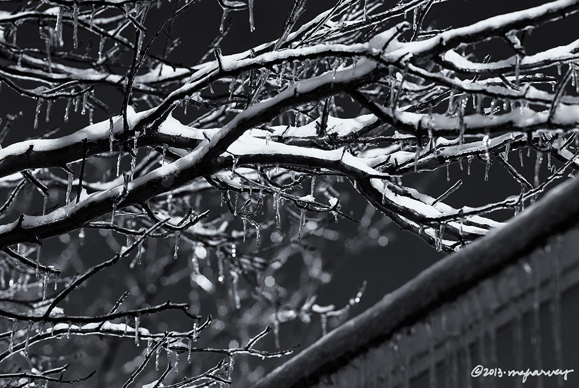 Then at the end of January, we got snow and ice. And it stayed cold for a while, with just enough sun during the day that all that frozen stuff could start to melt a little bit. But not much: in the morning the trees had icicles that looked like the prisms on a chandelier. It was pretty.