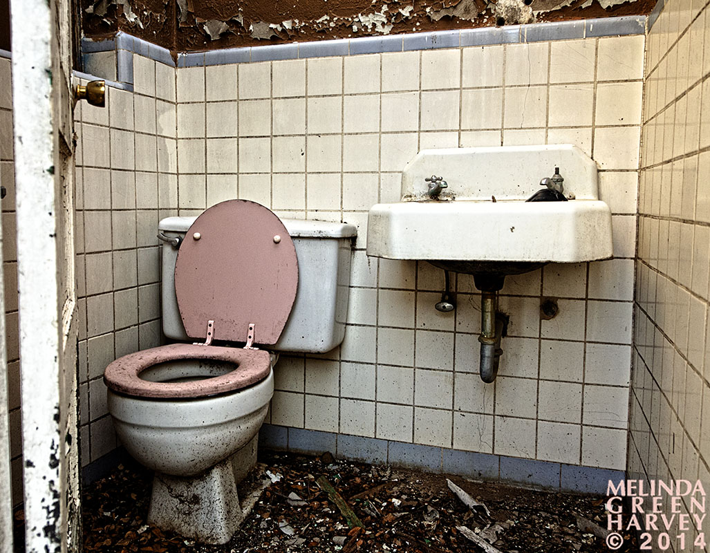 The restroom door was shut when I was exploring the place. And you probably would have laughed at the technique I used to open the door: I hit it, hard, with the heel of my hand, to pop the door open and scare away any critters who might be inside (although where I thought they’d go isn’t exactly clear to me.)