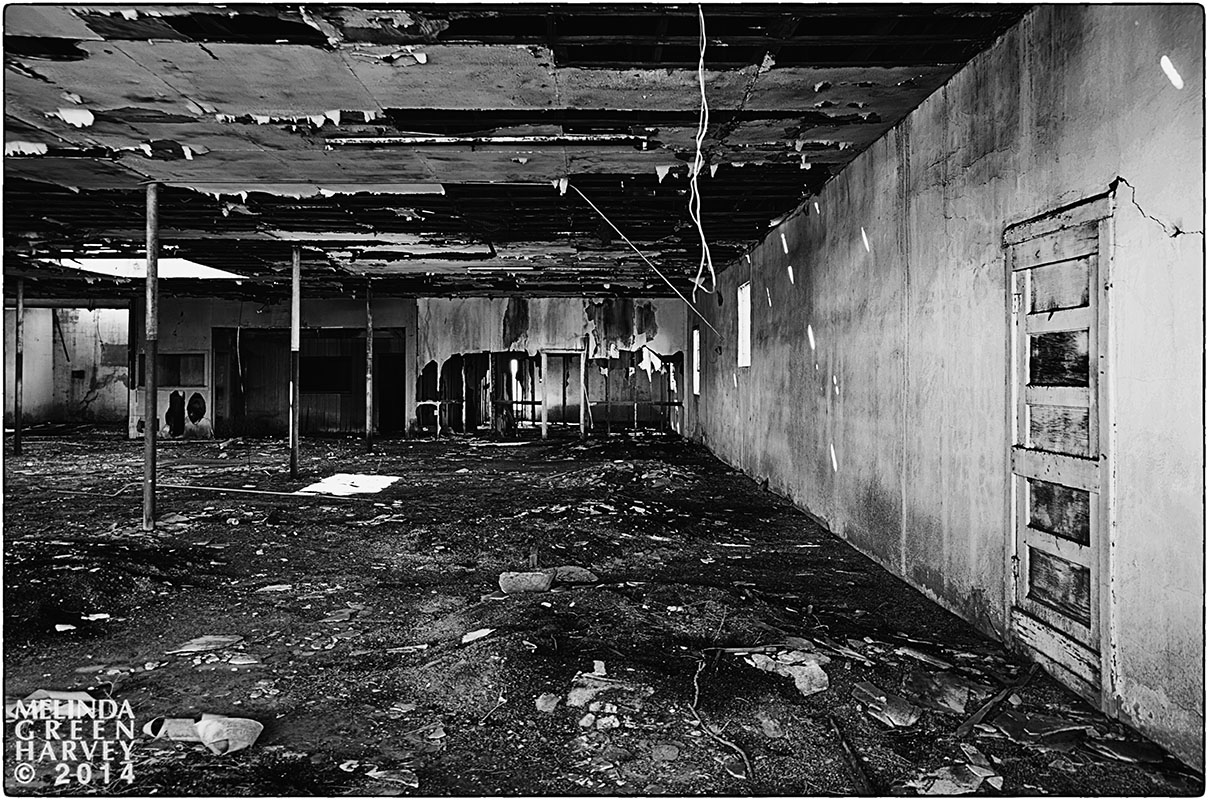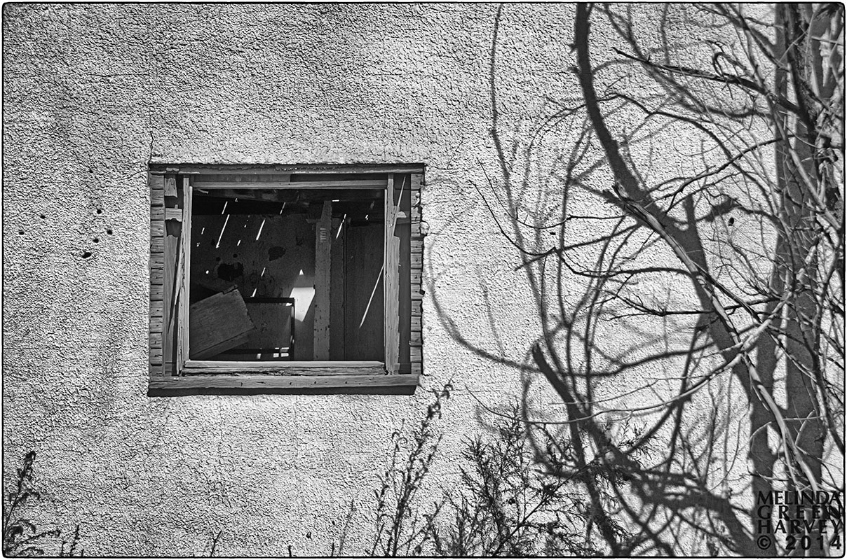 This is one of the six businesses Maple had at its peak; this one had two entrances and you can still read GROCERIES painted beside one door and DRUG COUNTER by the other one. I like the way the bits of light, from the holes in the roof, let the light play against the wall.