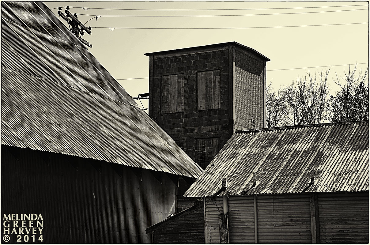 Part of the same cluster of buildings where I saw this was a sight to make me very happy: metal siding, metal roofs (some even with pipes poking through them), bare tree branches, power lines, and that very nice brick tower.