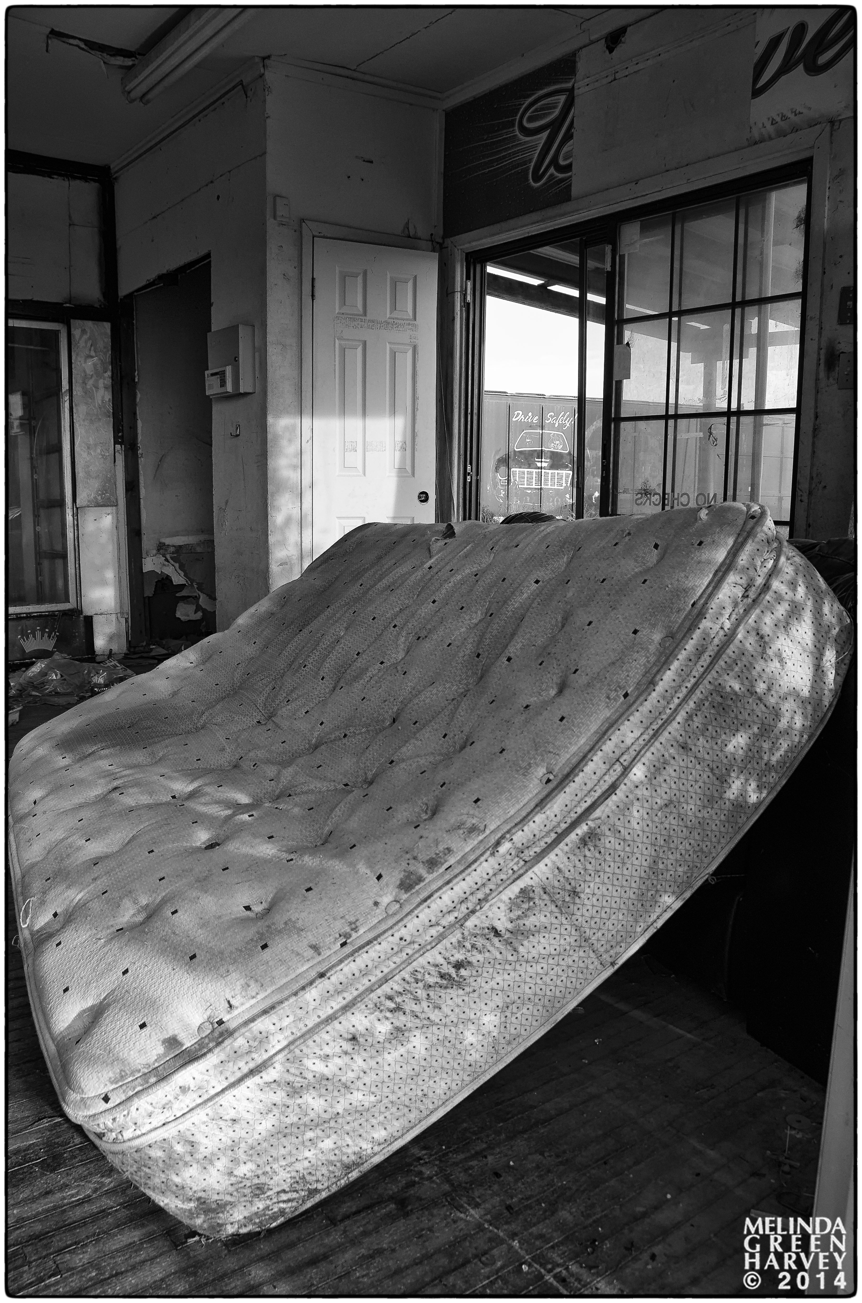 This place was one of those old beer stores; it had the requisite drive-through lane and looks to have featured Budweiser quite prominently. I can’t explain the mattress wedged into the building, but the “Drive Safely” sign is a thoughtful reminder.