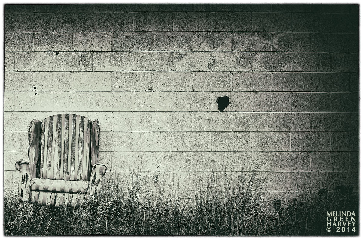 So, this chair. I found it behind that drive in from yesterday. The first thing I noticed was how the woven stripes in the upholstery weathered differently – half of the fabric was in relatively good condition, while the other half was just threads. The second thing I noticed was that hole in the wall to the right of the chair. For some reason, that hole seems…ominous.