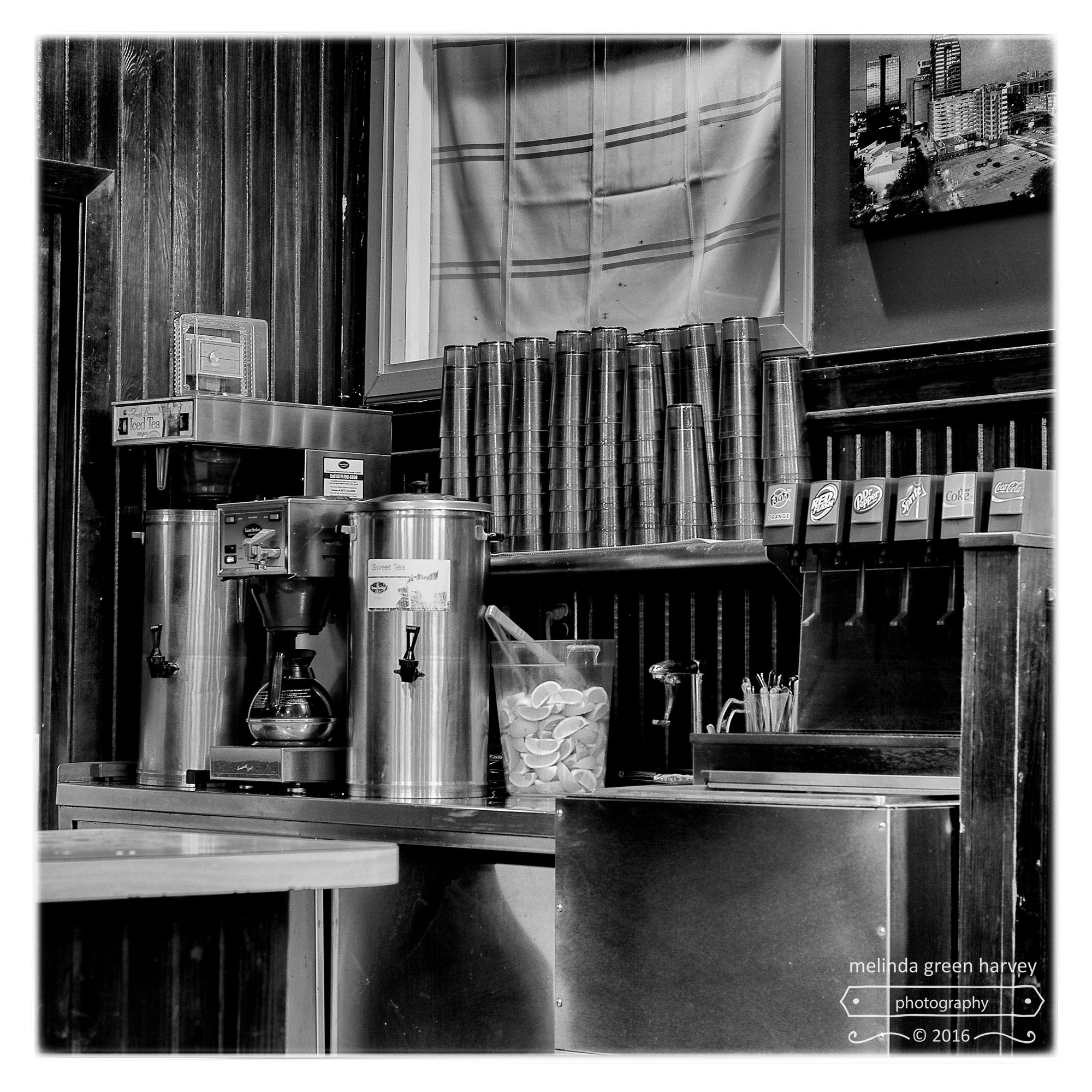 Unless you want to count the lovely drama of the beverage station, with the bucket of lemons, the framed photograph on the wall, and the stacks of glasses.