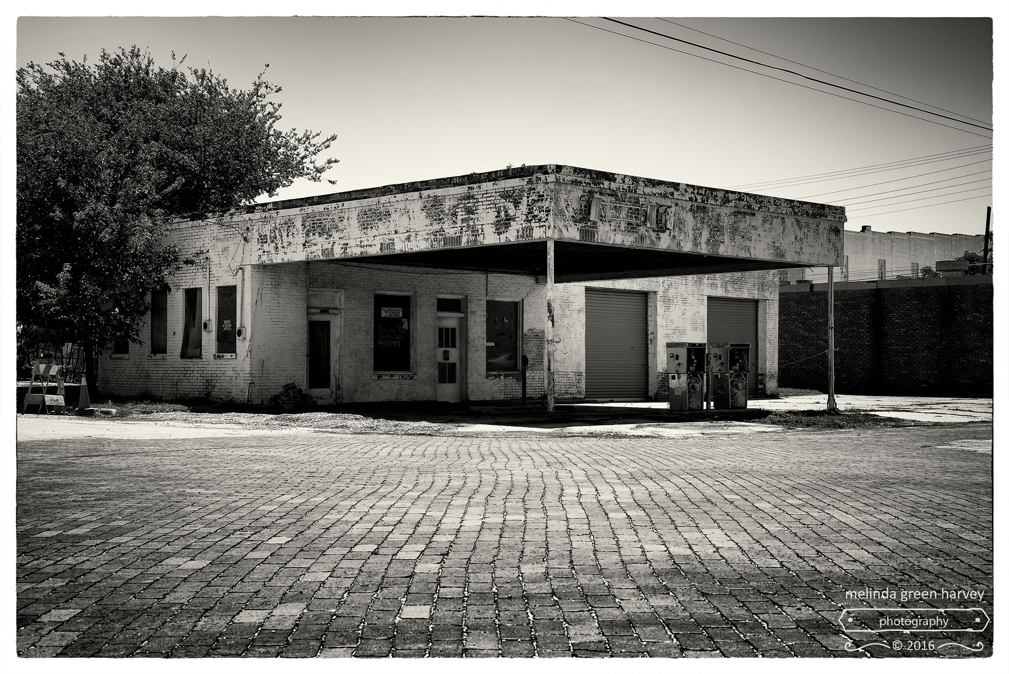 I really do like brick streets: they have more character than asphalt paving. Also, they provide some helpful leading lines in this shot of yet another abandoned gas station.
