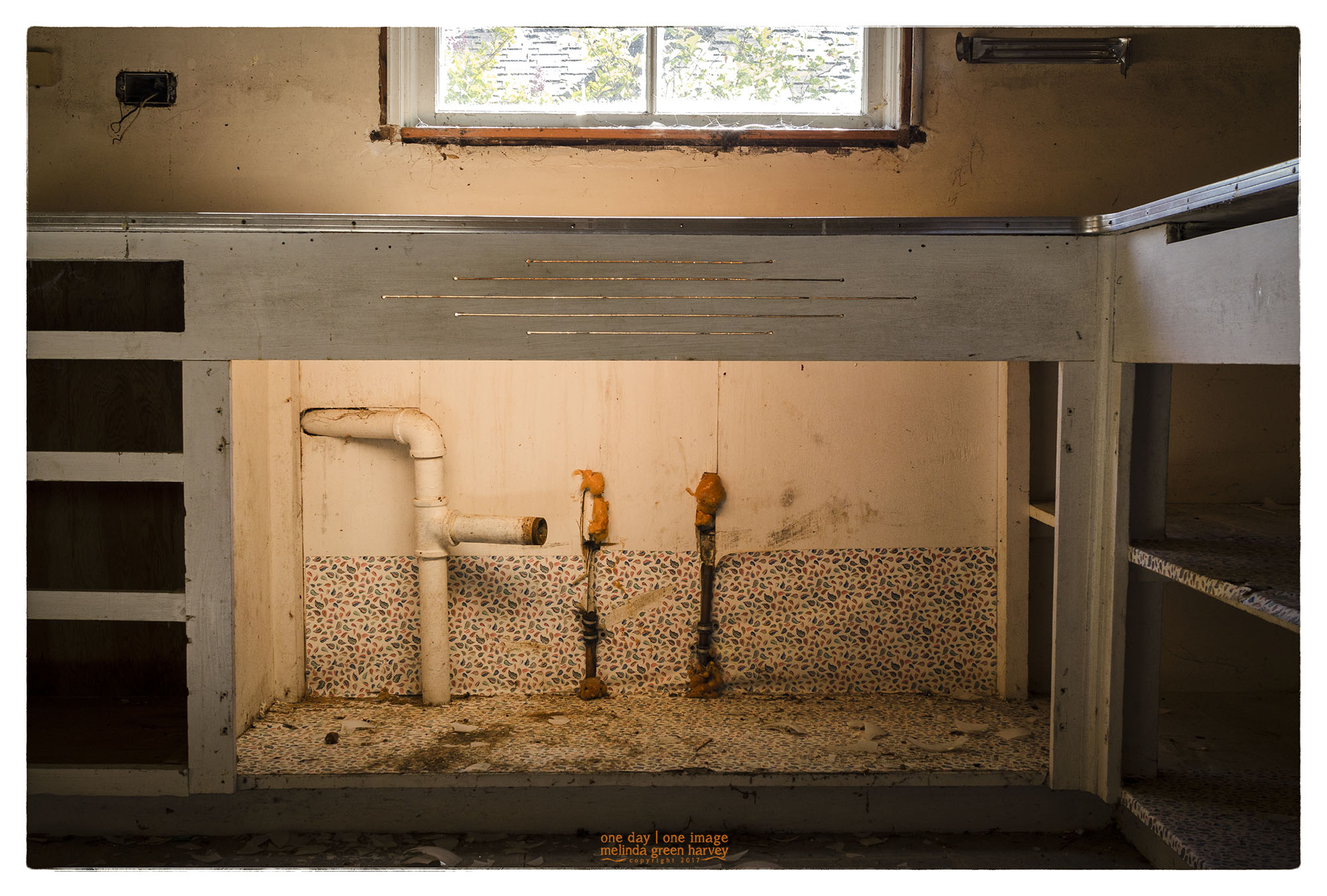 A couple of years ago my friend Ehpem and I spent some time photographing an abandoned house. I was happy to see the way the light from the window bounced around inside of the cabinet; lucky for me that the sink was gone!