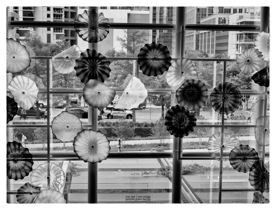 It was just yesterday when I mentioned turning my back on the Chihuly to get a photo of a trolley. And look what I did today: a photo of those very same Chihuly pieces. Only in black and white, because that’s the way I am.