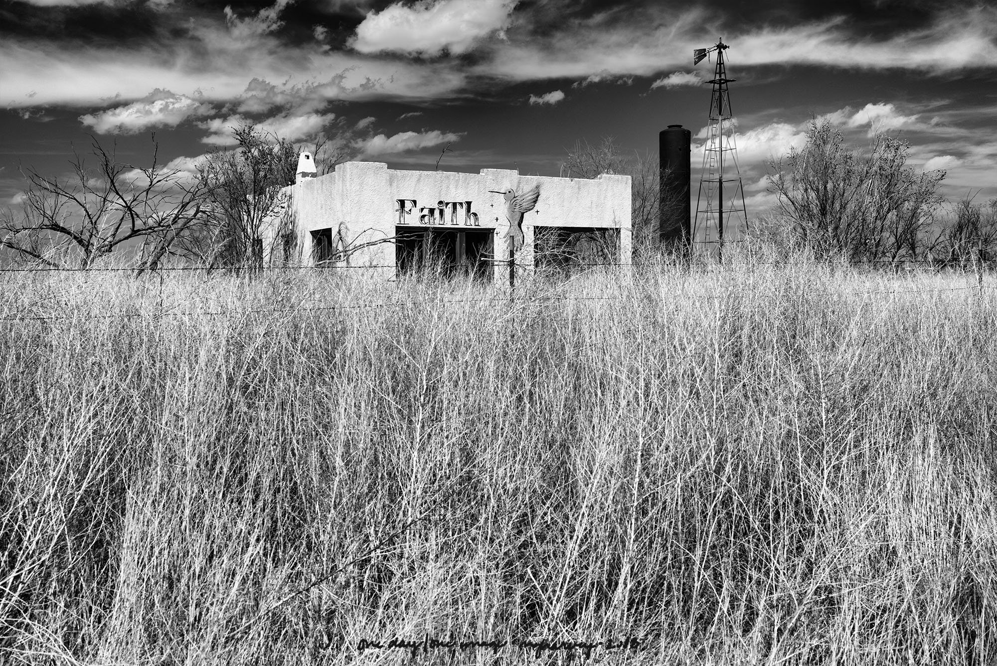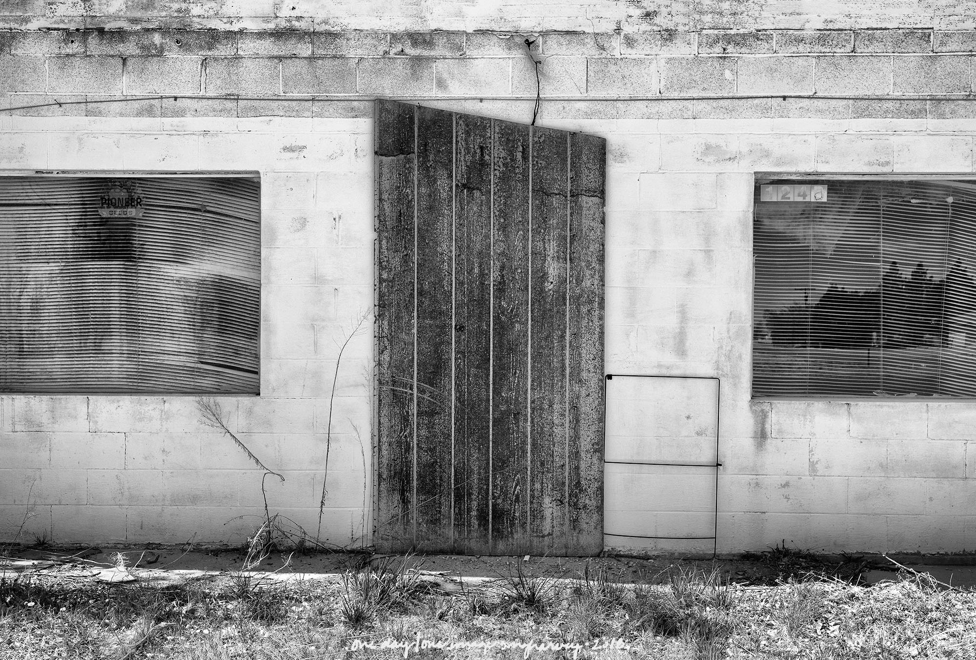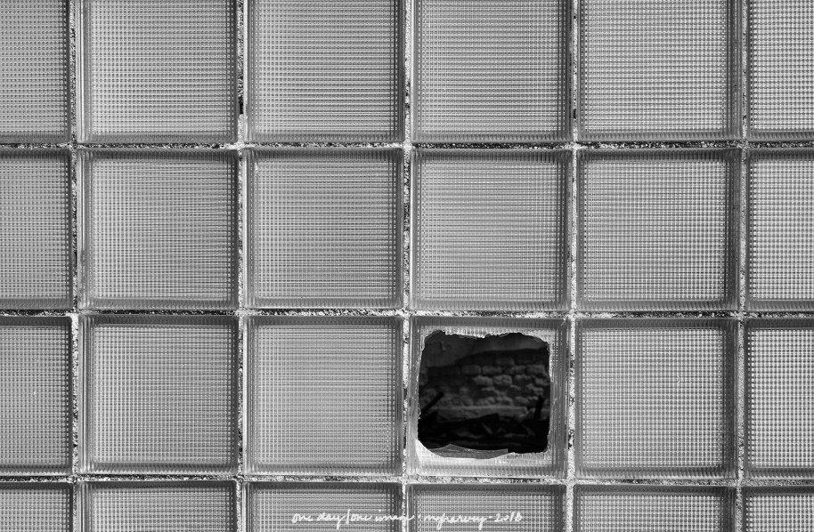 Somewhere along the way, the big windows on the front of the old school building were filled in with glass block. Naturally, I looked through the broken one, and spotted an adobe wall on the far side. I enjoyed the differences in textures.