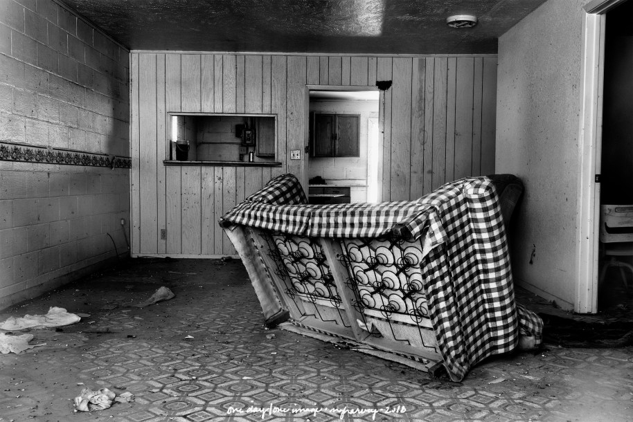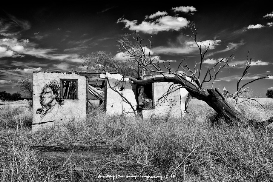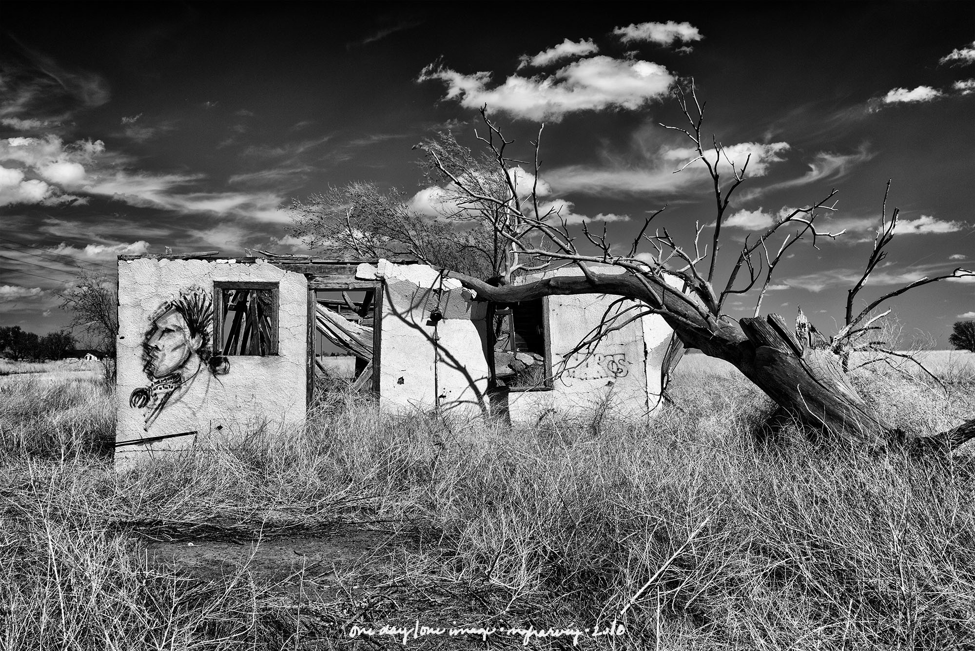 Another dead elm tree delivers the coup de grâce to an abandoned farmhouse. The only difference here is that this particular house has been decorated, for reasons that I can’t know.*