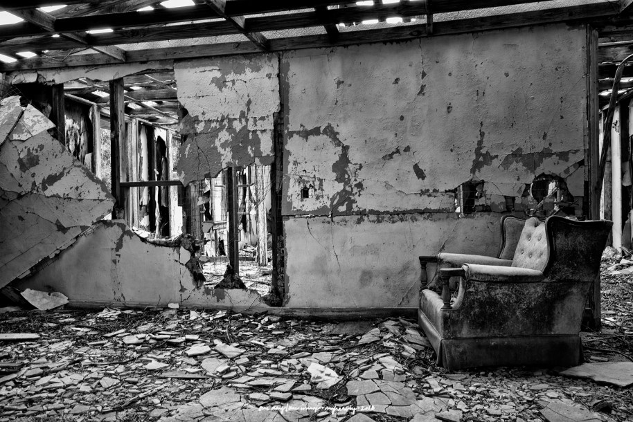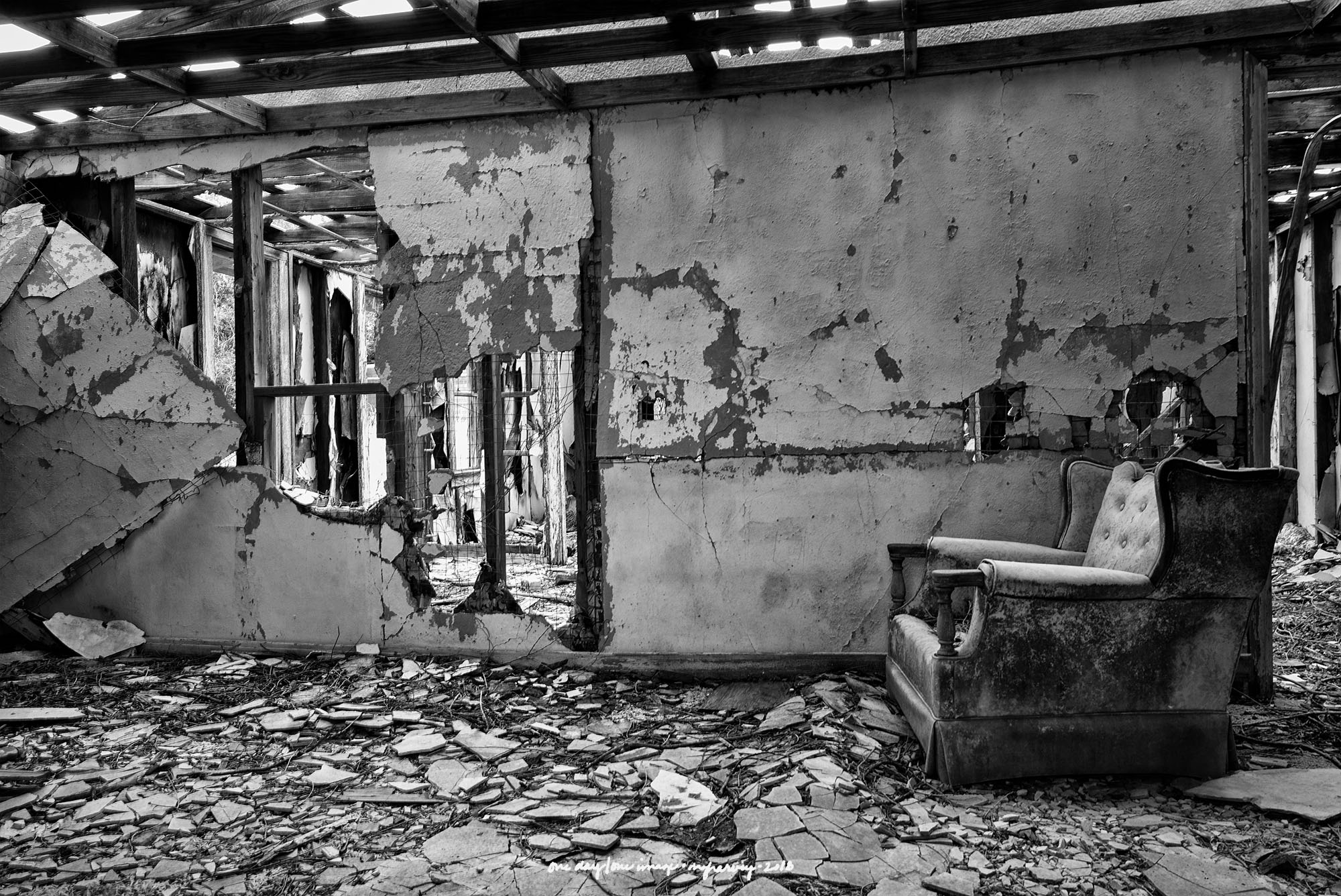 The main thing I think about when I am out photographing abandoned places is how the particular things I see were left behind. Was this chair broken? Too heavy to life? Maybe someone meant to come back for it? Maybe terrible things happened in the chair, and no one wanted it?