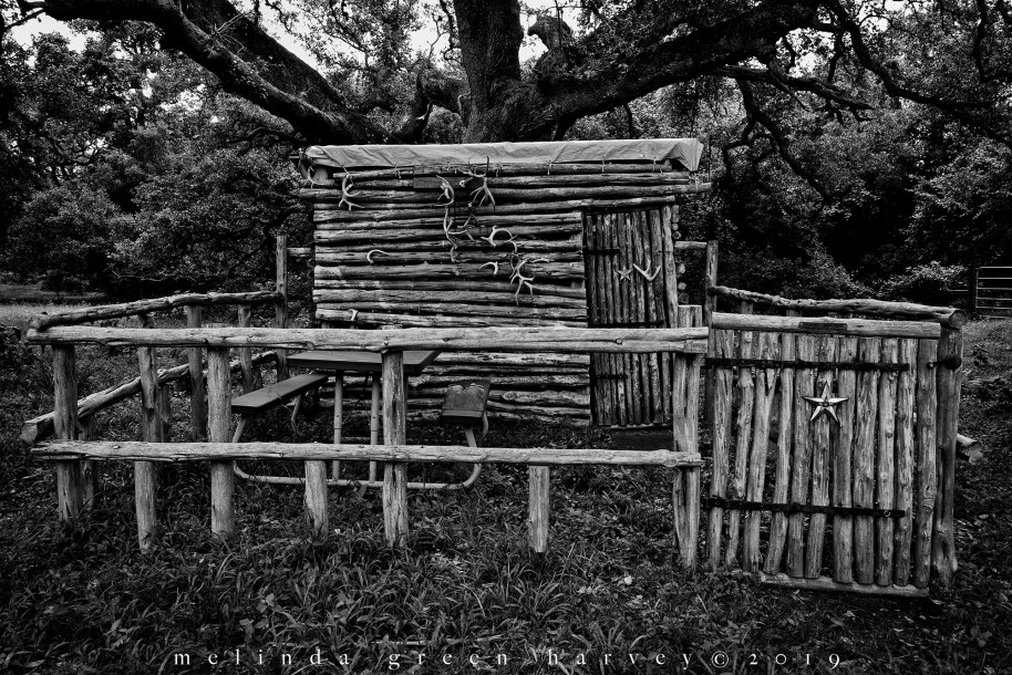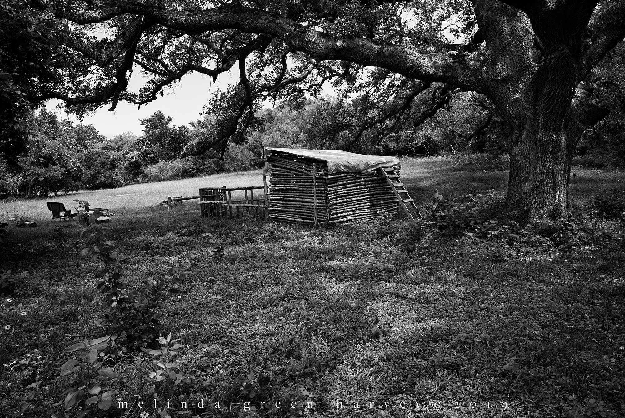 This giant oak tree was probably already around during the Texas Revolution. That jacal came later. I think.