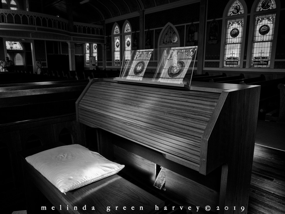 The older, smaller church had been transformed into the church hall. The resourceful church members kept all the old trappings in the apse of the church hall, because I guess you just never know when a spare communion chalice will come in handy. And, to be on the safe side, all the accoutrements are locked behind a gate. Fortunately for itinerate photographers, the gate’s grate is large enough to accommodate a camera lens.