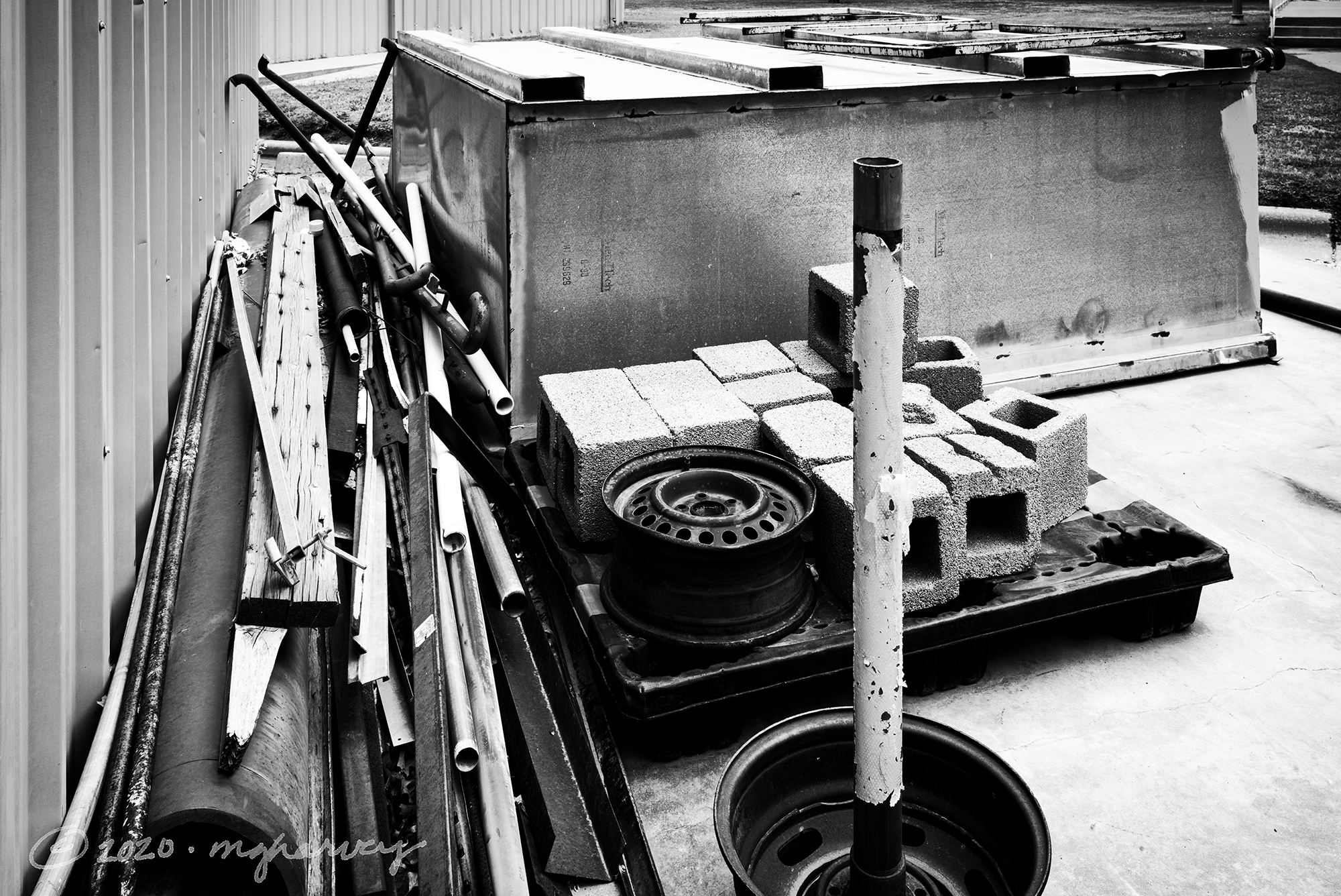 In addition to liking to find stacks of chairs, I also like to nose around the backs of places: I’m interested in seeing what sorts of random things are kept and try to imagine why they are there. This was a particularly interesting set of crap.