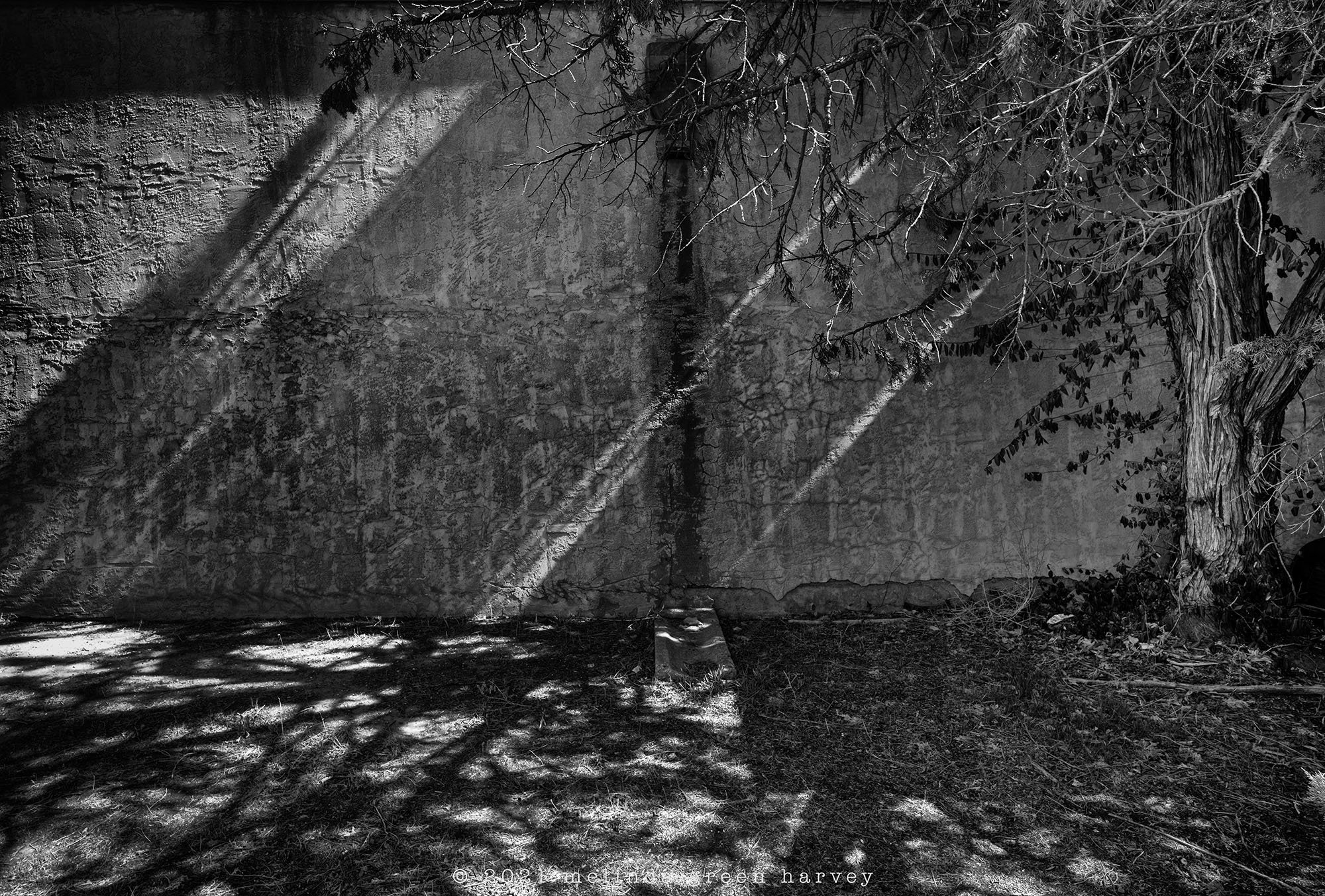 I was walking around the now-abandoned hospital (the one where my grandpa died, but I wasn’t getting any weird feelings about that) when I saw the way the afternoon sunlight was slanting across the rough stucco wall. And then I noticed the stain left from the old downspout. Not a bad pair of things the old place had to offer.