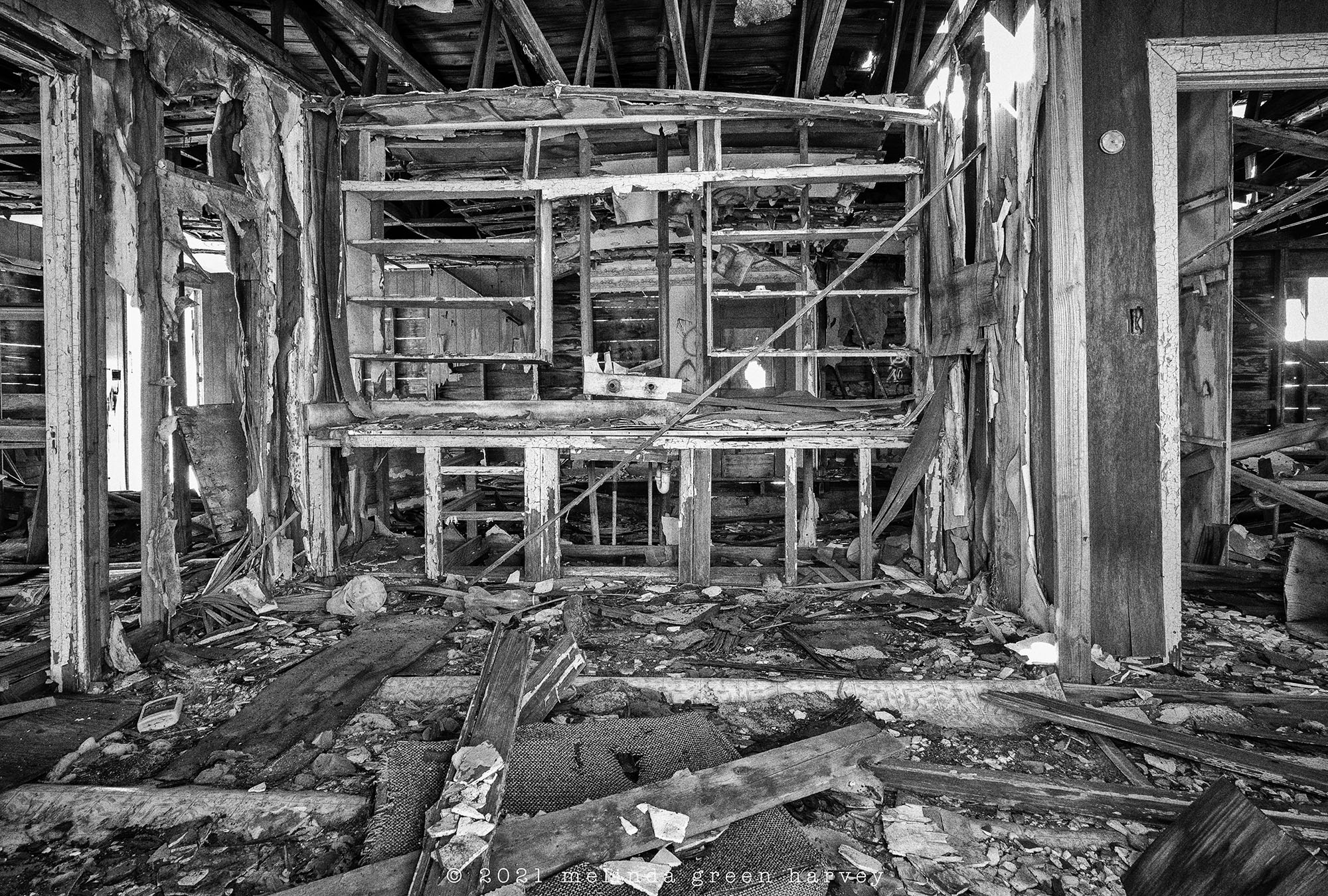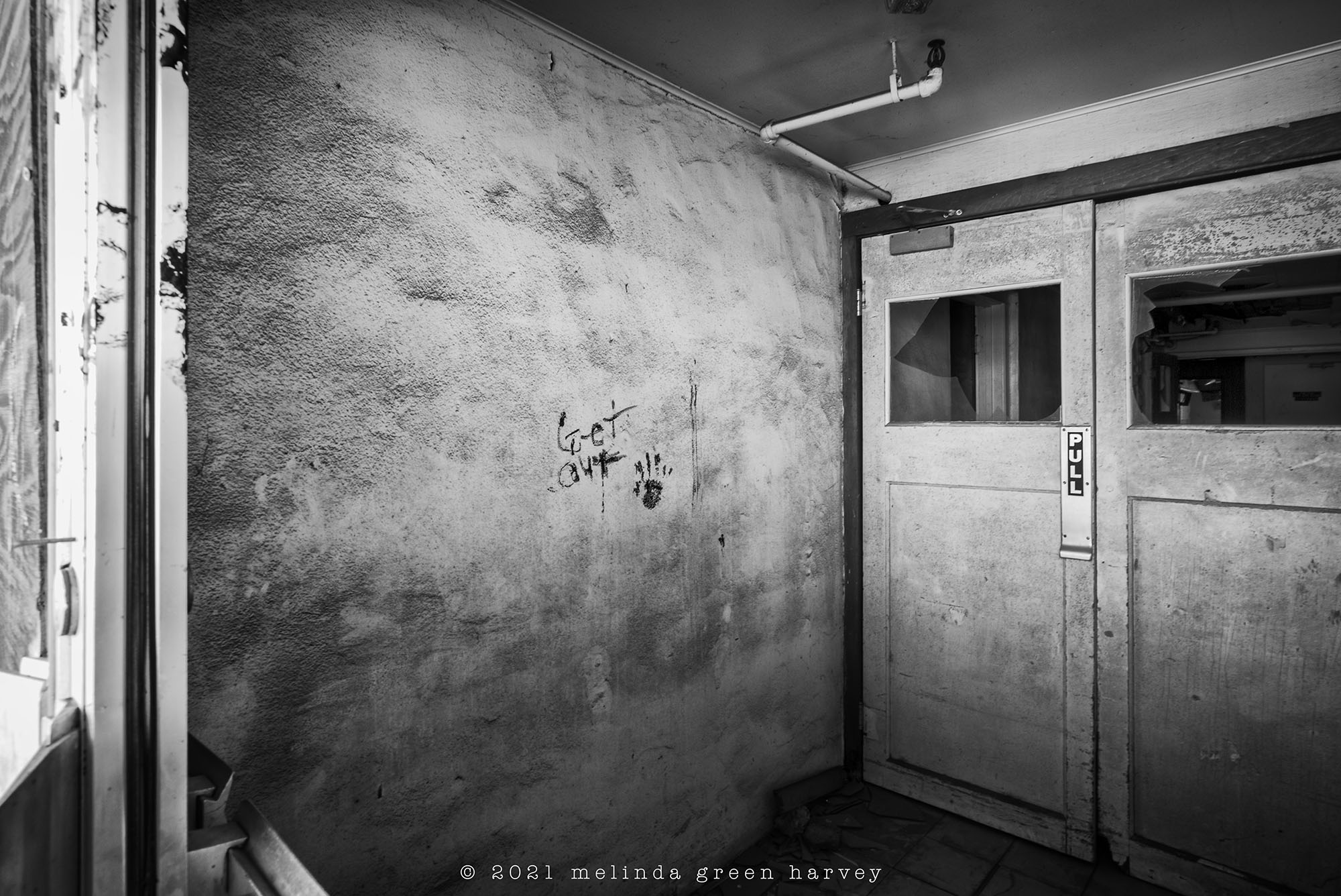 The spray-painted non-official notice on the front of this house indicated it was scheduled for demolition on December 7, 2020. Obviously that didn’t happen, but it looks as though the house is demolishing itself, rendering the missed date more or less beside the point.