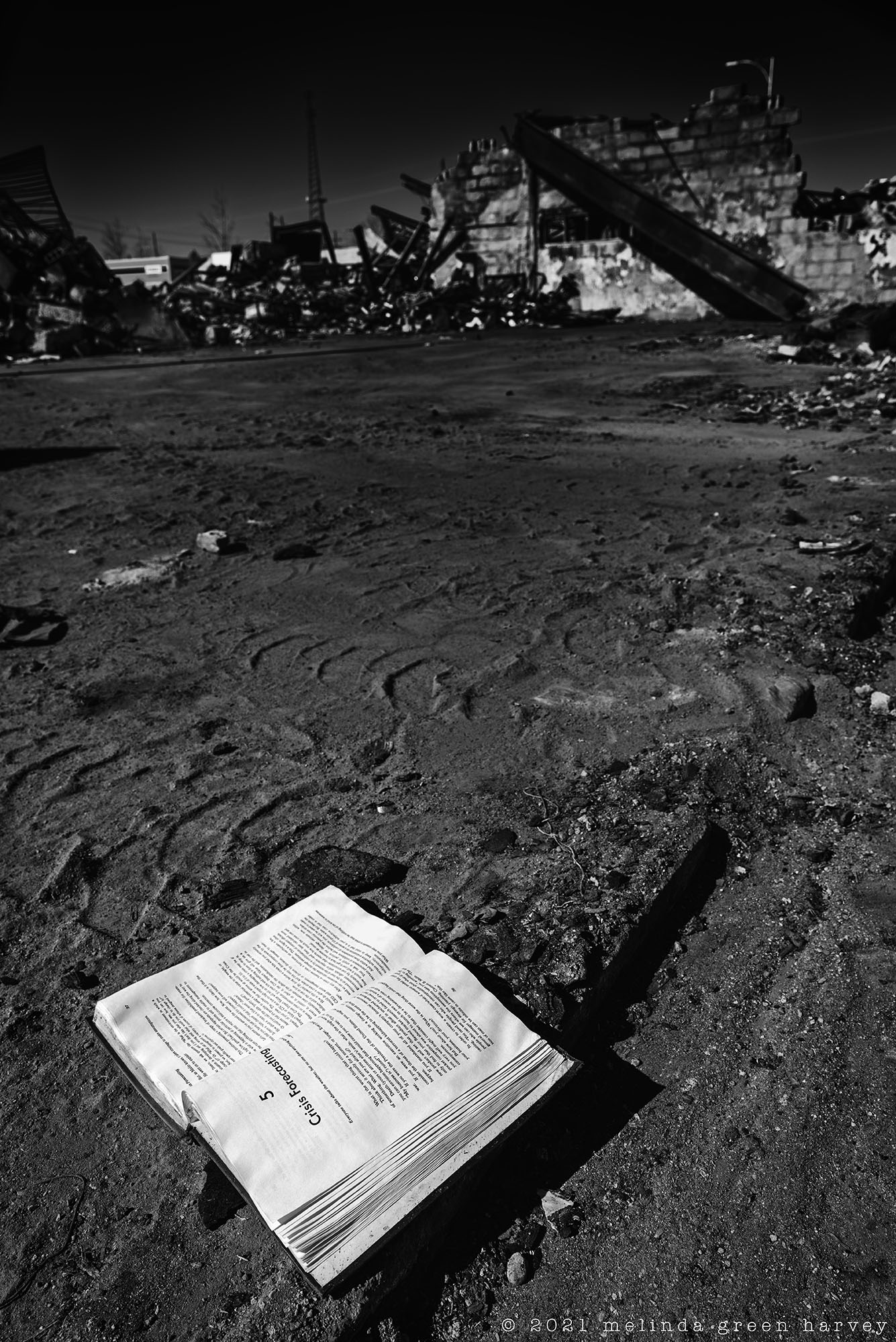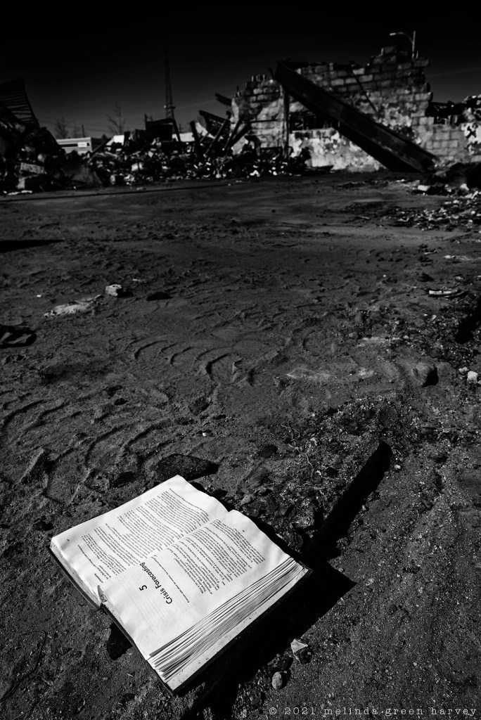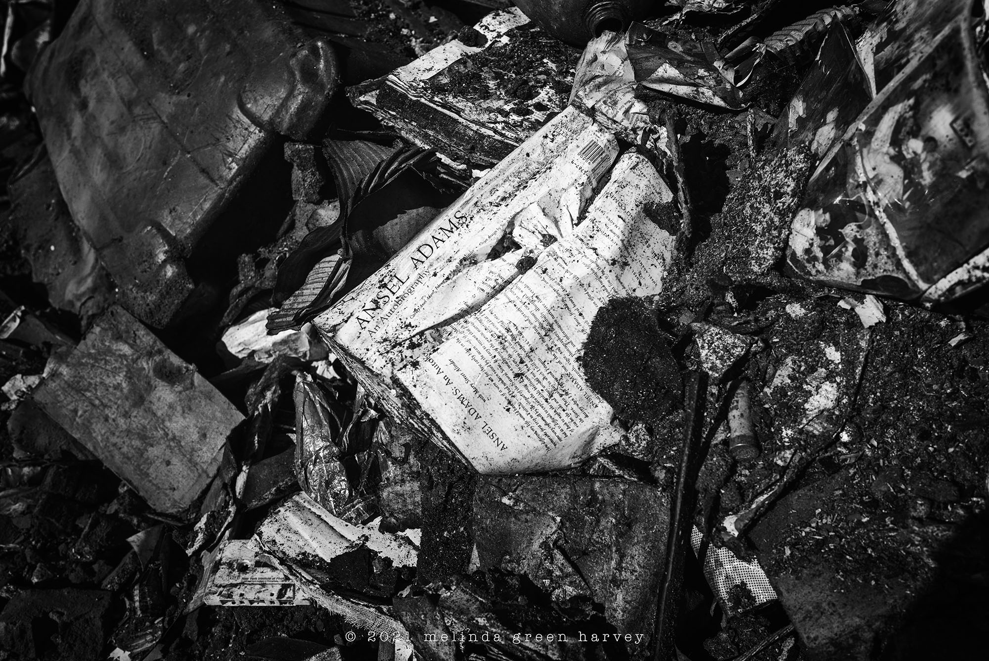 There was a fire in downtown Lubbock last month; some apartments, a barbershop, and a used book store were destroyed. Naturally, my camera and I went out to look around; by the day I explored, the salvageable things (metal joists, mostly) had been pulled out to one side and everything else was pushed into a pile. And, shining like a beacon from the pile was Ansel Adams’s autobiography.