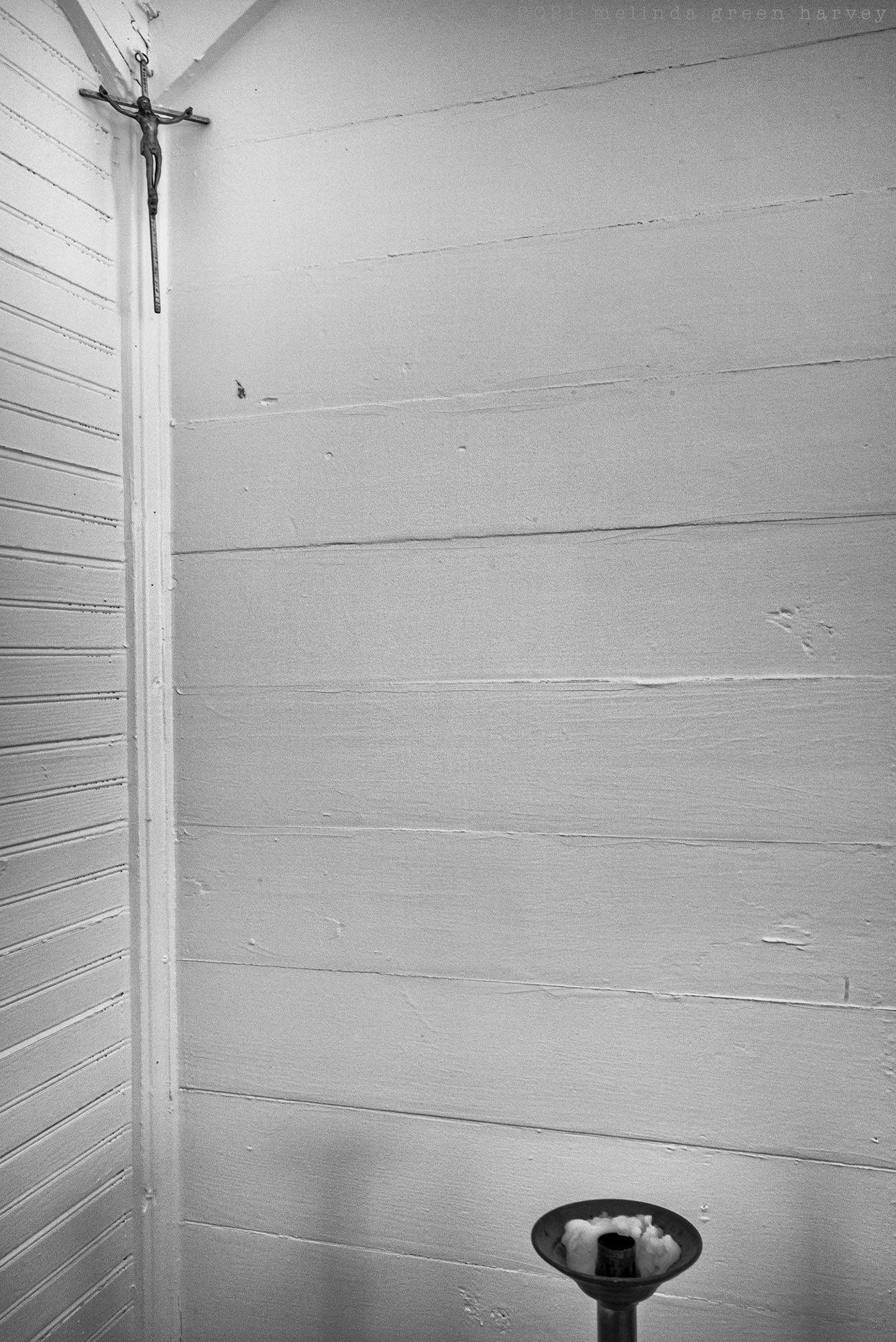 But anyway, I went inside to have a look around. One of the best sights was this thin crucifix, hanging high on the wall and offset by a waxy candleholder. Add in white wooden walls and some vague shadows, and it was obvious that I needed a photograph.