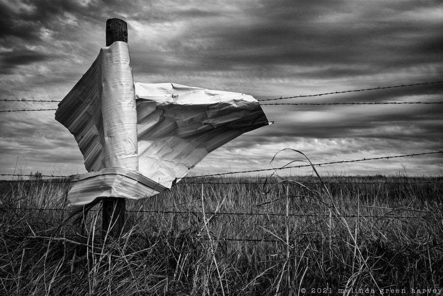 A few days later, my work on the project completed, I headed for home. Along the way, I passed through a swath of damage from the earlier storms, including this piece of sheet metal that was wrapped around a fencepost.