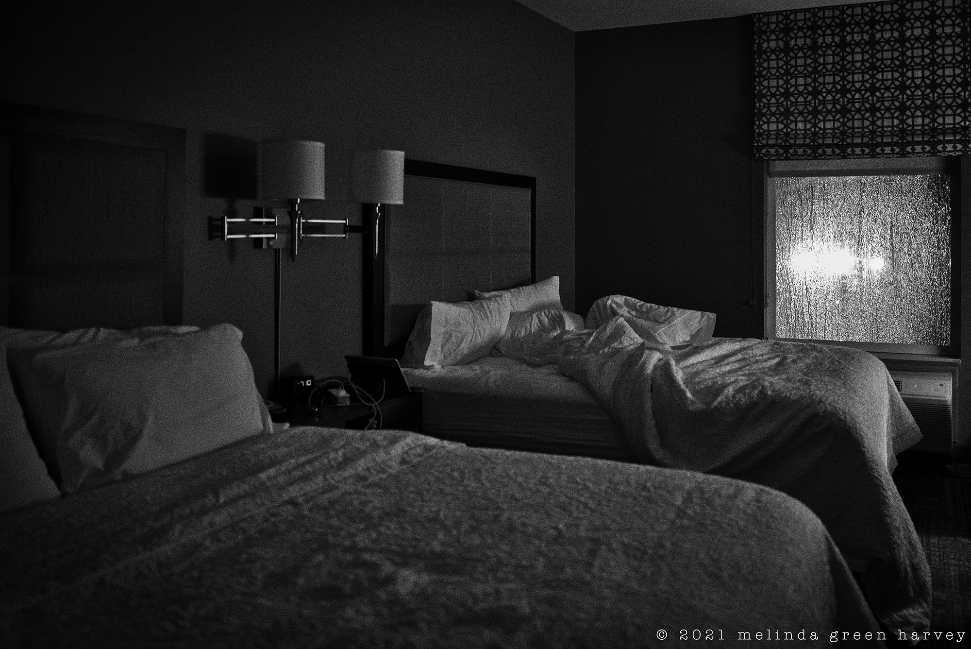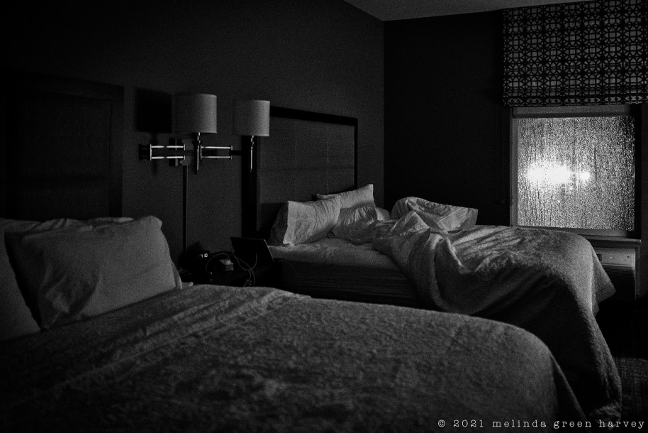 My side of the hotel faced the turnpike, which could account for those extremely bright floodlights, lighting the way for weary, moth-like travelers. On my last morning in Oklahoma, heavy rain on the windows diffused the light…but not very much.