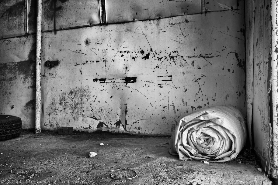 So, I pulled off the road to photograph a falling-down wooden building. It offered only marginal photographically-interesting things, so I wandered around a bit more and then found this. I made the photo because of that rolled up thing in the corner, but between when I made it and when I wrote this post, I changed my mind: now my favorite part is the scars on the metal wall, which speak to generations of various kinds of farm equipment banging into the wall.
