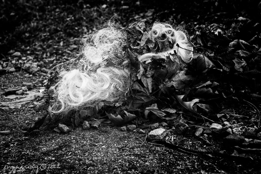I sort of hate to even think about the circumstances that would result in a wig, tangled up in leaves, left at the edge of a street. It can’t have been good, right?