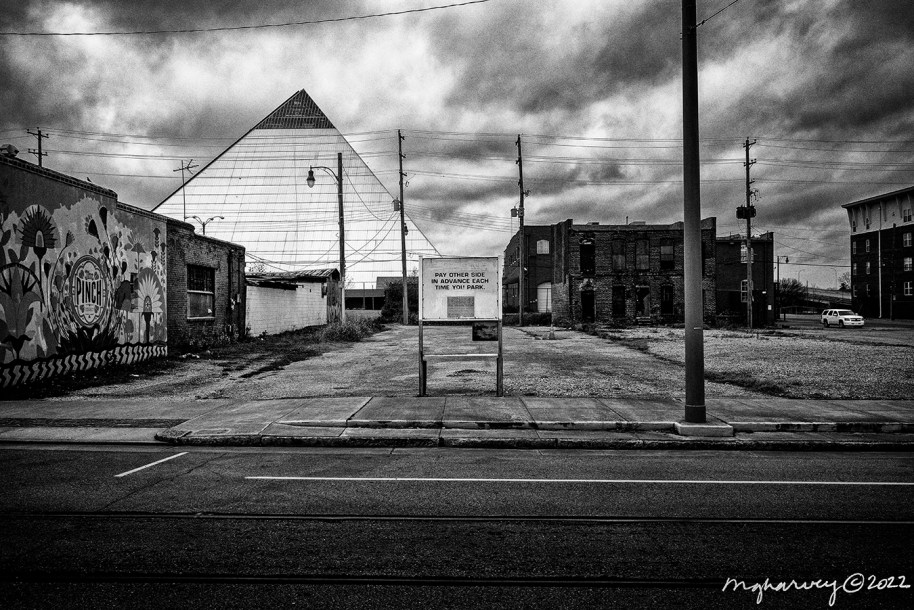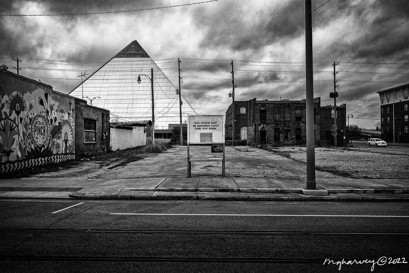 The pyramid dominates the Memphis skyline, if you’re in the right part of town to see it. It’s a Very Big Deal to visit the thing, which houses a Bass Pro Shop and a hotel as well as a restaurant and viewing platforms up at the top. The mashup of an over-the-top outdoor store and the Big Cyprus Lodge INSIDE A DAMN PYRAMID made me a little dizzy. So I just photographed an empty parking lot on a side street and called it good.