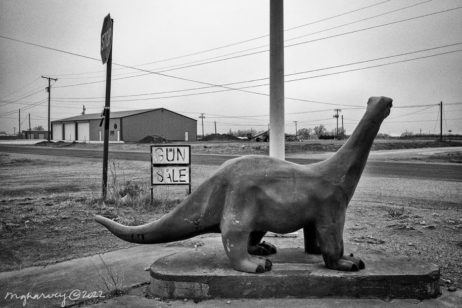 I ended up in this tiny town because there was an unfortunate sign out on the highway that I wanted to photograph (although I will not dignify its message by posting a photo), and while I was at it, I went ahead and checked out the town. And that’s how I happened to see a weather-worn sign for a gun sale and a dinosaur in the same spot.
