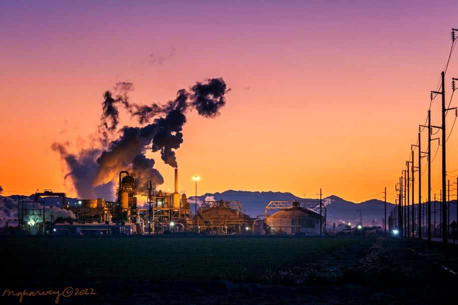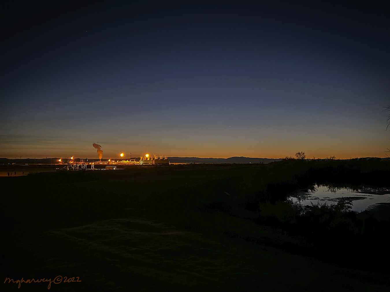 Just after sundown, the lights of the geothermal plant glow. And somehow, the surface of the water also glows.