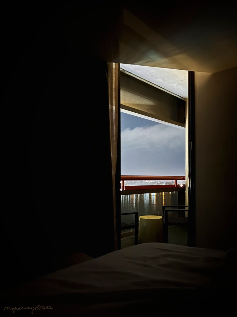 The very nice front desk person at the hotel hooked me up with a balcony room, and I slept with the door open every night. One night, I had dozed off and when I woke up I saw this lovely scene. I made a photo then went back to sleep.