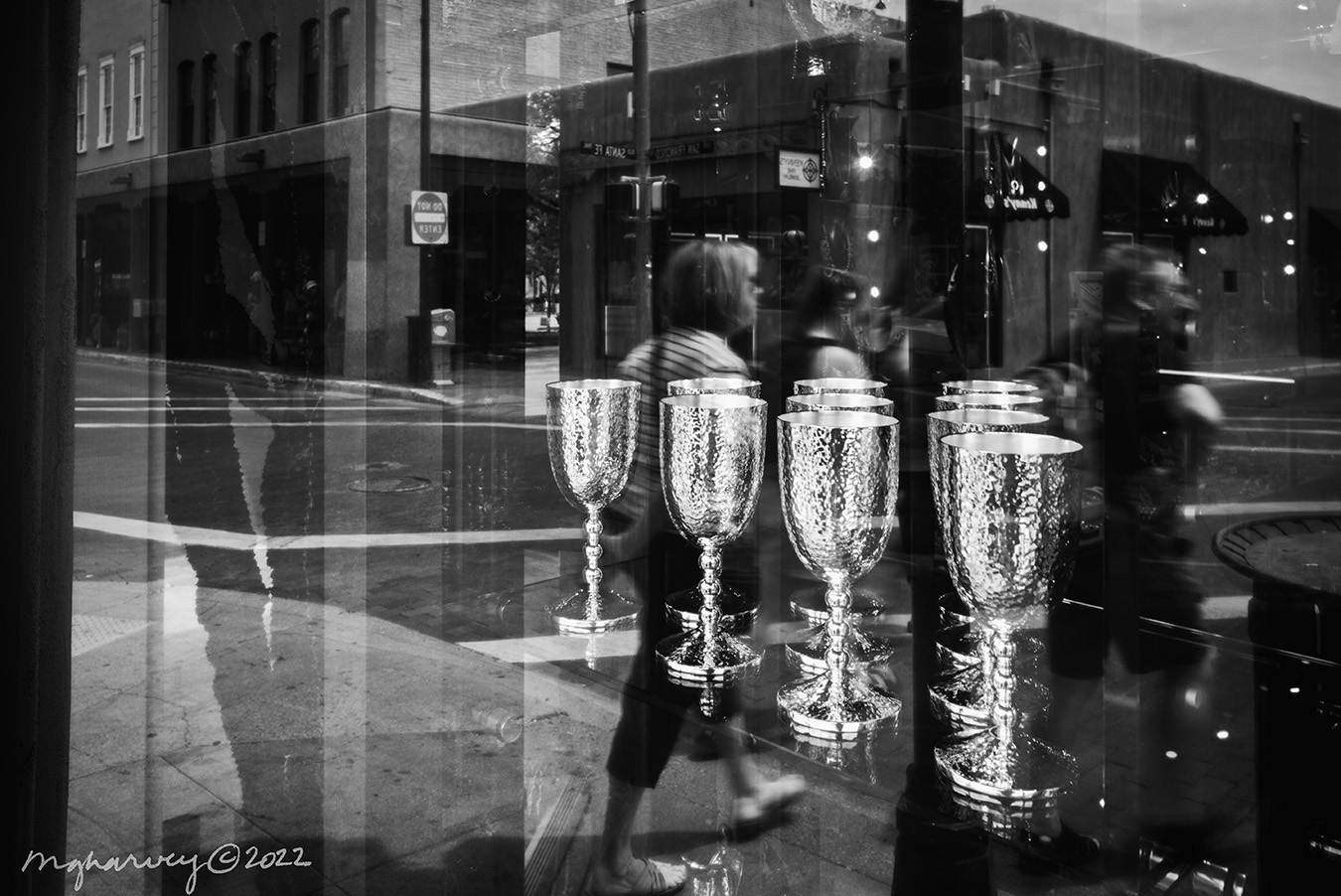 I’ve been thinking about the way our eyes and brain work together to parse out a scene that’s got a lot of reflections in it, rendering a version that makes sense. But a camera doesn’t do any of that, and a scene caught by a lens stays chaotic – in a way that I am quite fond of. Especially when it involves fancy silver goblets and pedestrians.