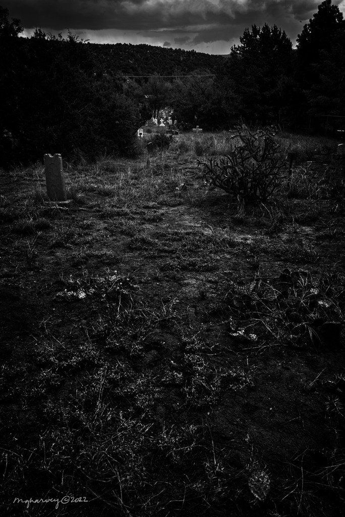 Up in the mountains above Albuquerque alongside the road that’ll take you the back way to Santa Fe, there’s a little cemetery wedged between a Burger Boy and a gas station. It’s a humble, unassuming place. Unless you count the clouds and the tiny bit of light on those graves.