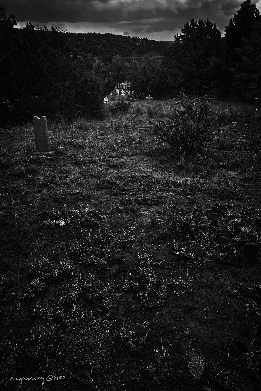 Up in the mountains above Albuquerque alongside the road that’ll take you the back way to Santa Fe, there’s a little cemetery wedged between a Burger Boy and a gas station. It’s a humble, unassuming place. Unless you count the clouds and the tiny bit of light on those graves.