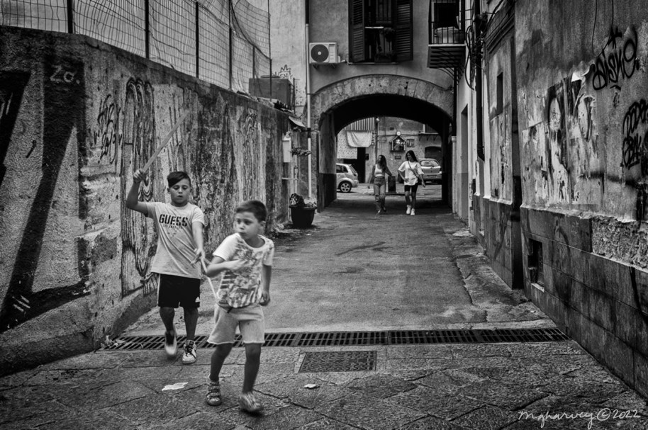 One of the ruins was very near where we stayed, and the wire fencing on the left side of the photo surrounds the rubble. But, even with war ruins that are almost eighty years old, life in the rest of the neighborhood goes on, with boys playing a made-up game as two young women strolled along. (And as a quartet of photographers watched and, possibly, made more than a few images.)