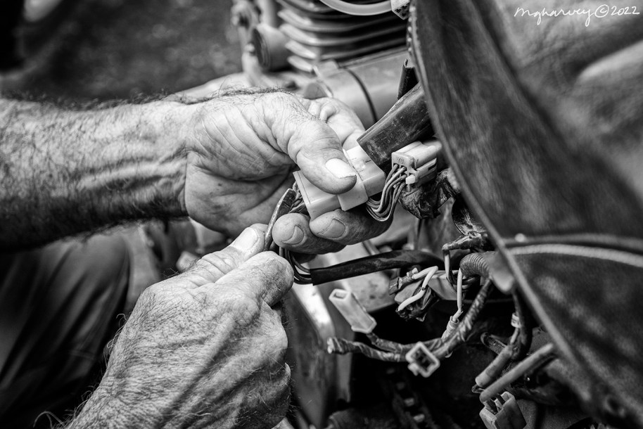 This gentleman spent a long time working on a motorcycle. His shop was a little space along the street and the curb served as his toolbox.