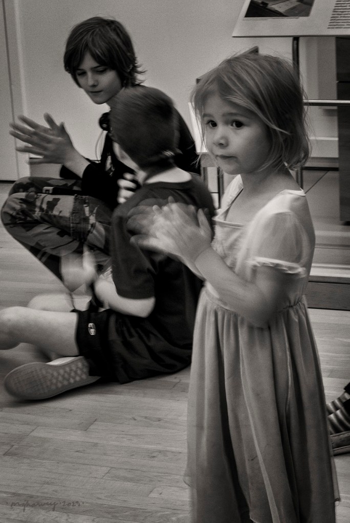 During the demonstration of the orchestrion (a self-playing musical contraption), I watched this little girl. She was standing up, ready to hear some music, when she noticed that all the other kids were sitting down. I guess she decided that she didn’t want to be only one standing, so she sat down, but only momentarily: as soon as the music started, she was on her feet.