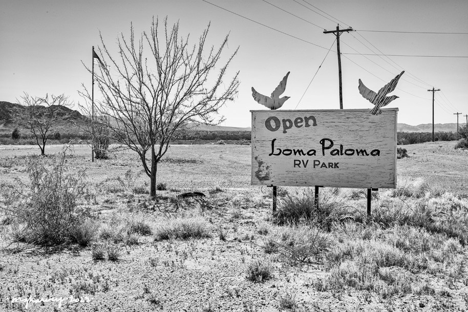 I like the rhyme on the sign. I like the rhythm of the utility poles. I like the amount of sky. I like the desert. I like those mountains down the way. I like the slightly back-lit effect on the flag.