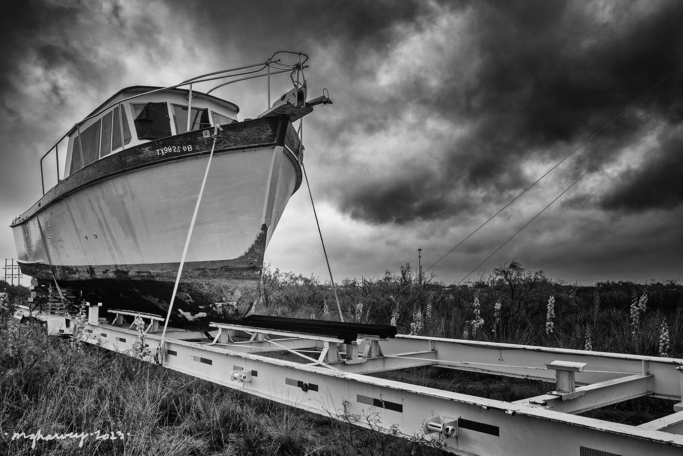 Yet, somehow there’s a 37′ boat* (which was built in 1976)* on a trailer on the top of a hill over on the north side of town.