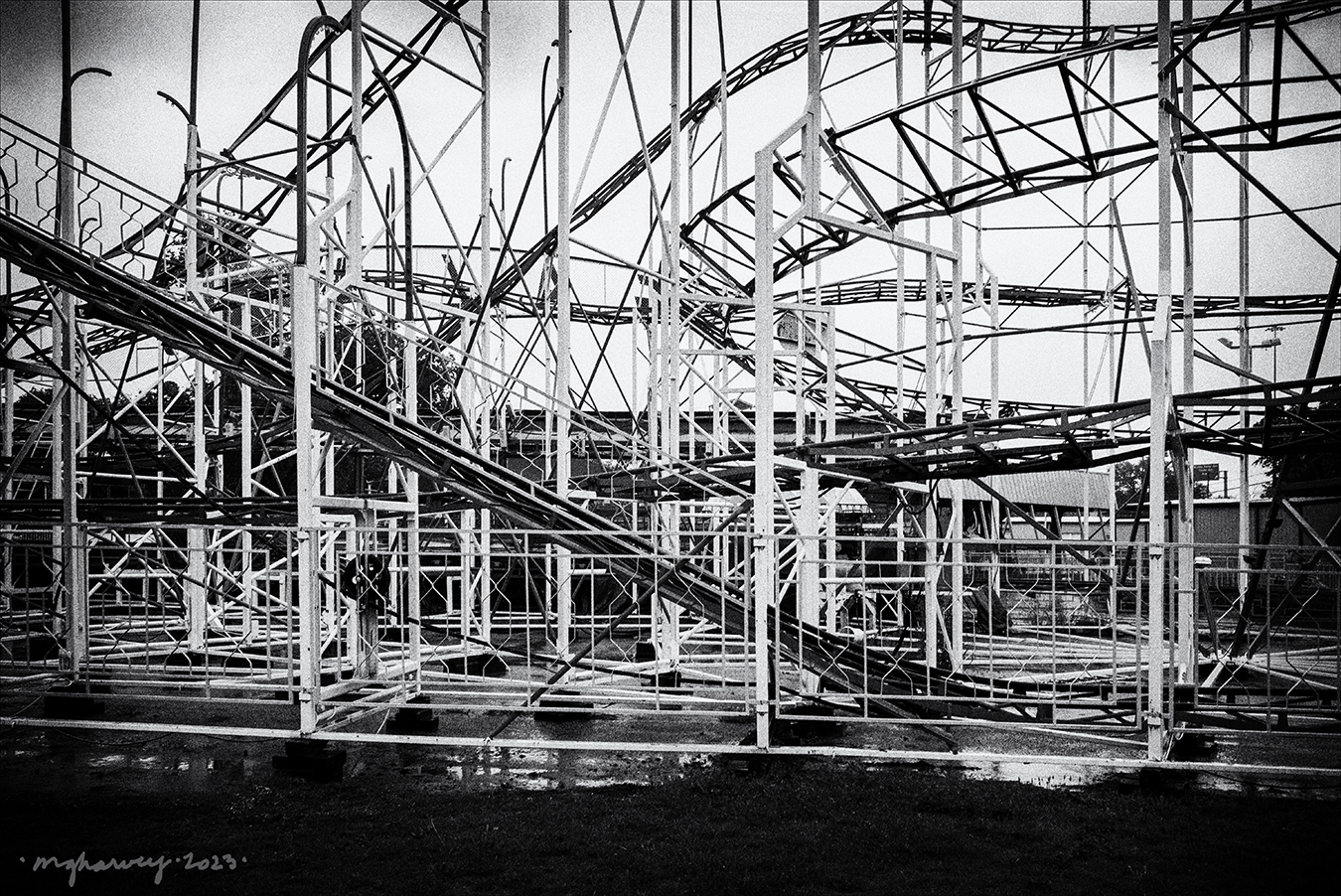 The local amusement park shut down this year, after 50 years of operation. I decided to go look at it the other morning; the cold rain made it seem even more forlorn that it already was.