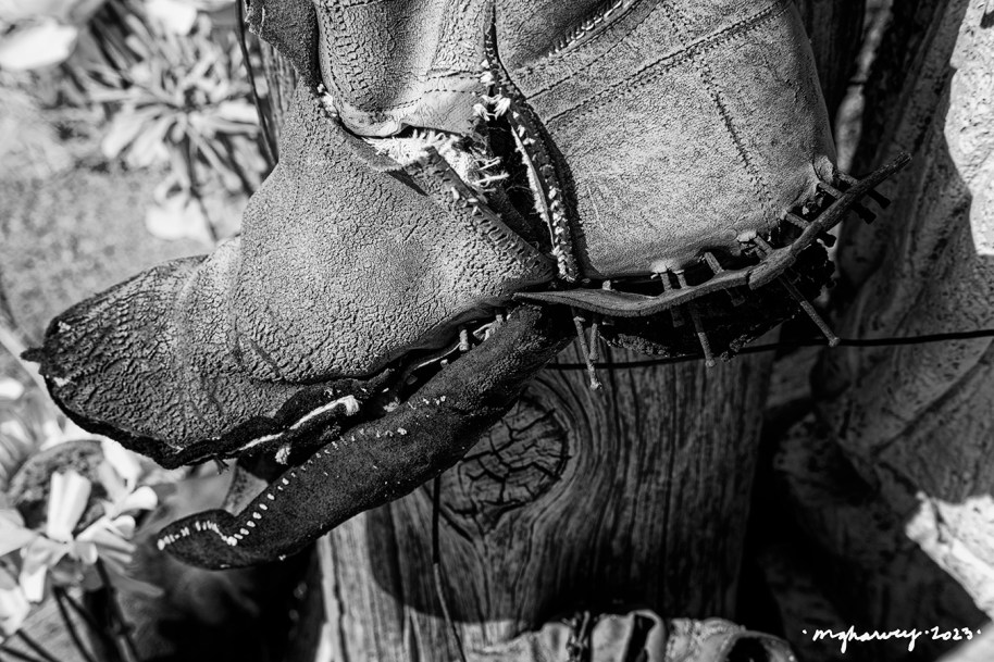 The grave marker way down at the end of the cemetery had a thick square wooden post and several cowboy boots hanging from it. This boot, which was in full sun every single afternoon that wasn’t cloudy, was much the worse for that level of sun exposure. I don’t guess I understood how many nails there are in a boot until I saw this one.