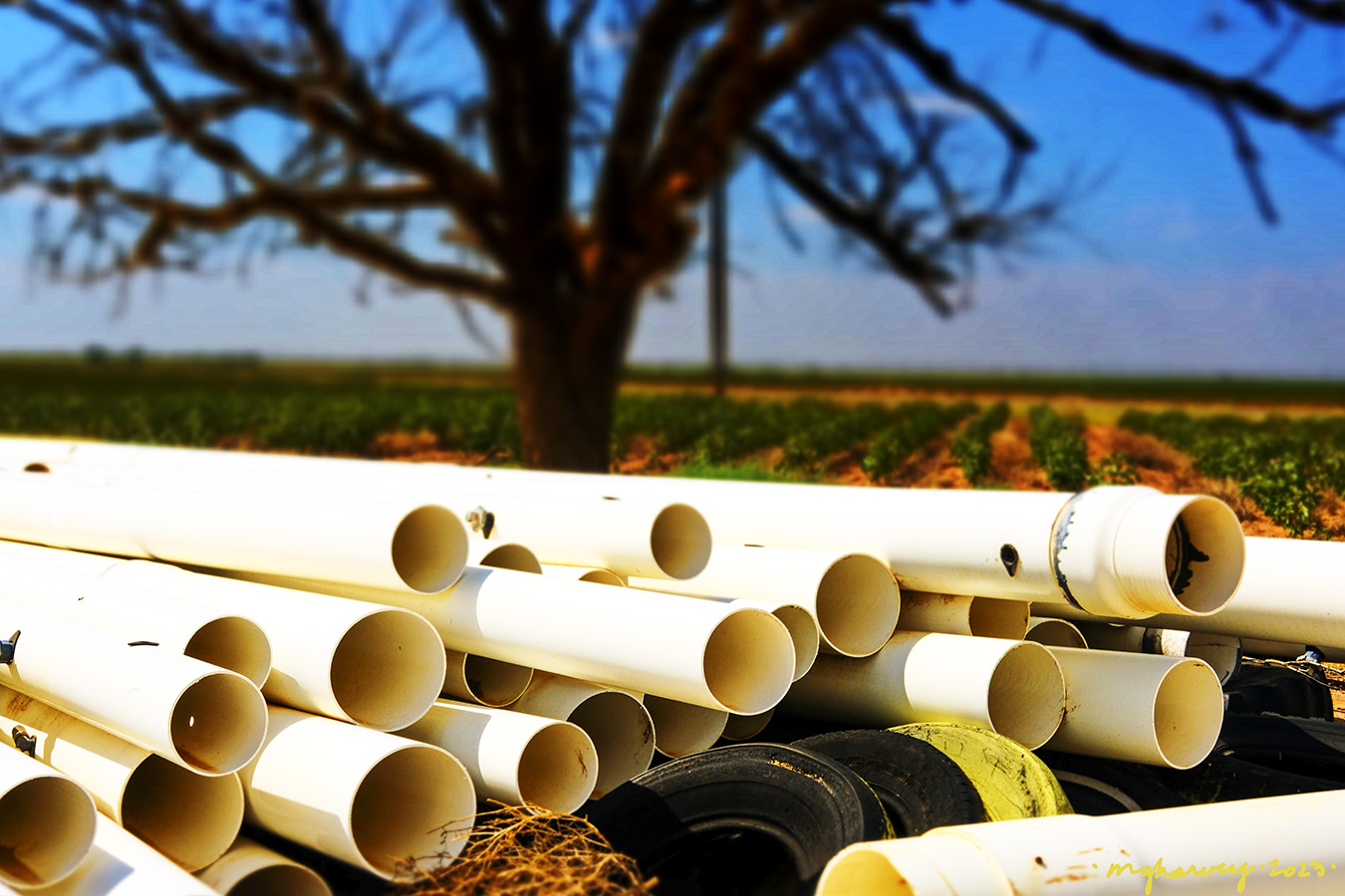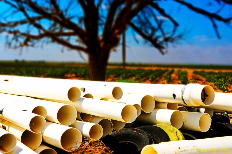 I stopped to photograph an abandoned farmhouse and then became distracted by the bright white irrigation pipes stacked up behind the place. (The crop behind the pipes? It’s cotton and the bolls were already set on the plants and couple of them had opened, revealing cotton as white as the pipes.)
