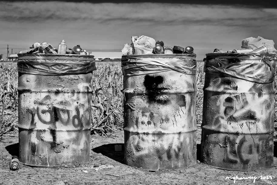 At this point, those old cars are mostly thick layers of spray paint instead of the namesake Cadillacs. And what the usual photos of the place don’t show you is the trash barrels that are perpetually full of empty spray-paint cans.